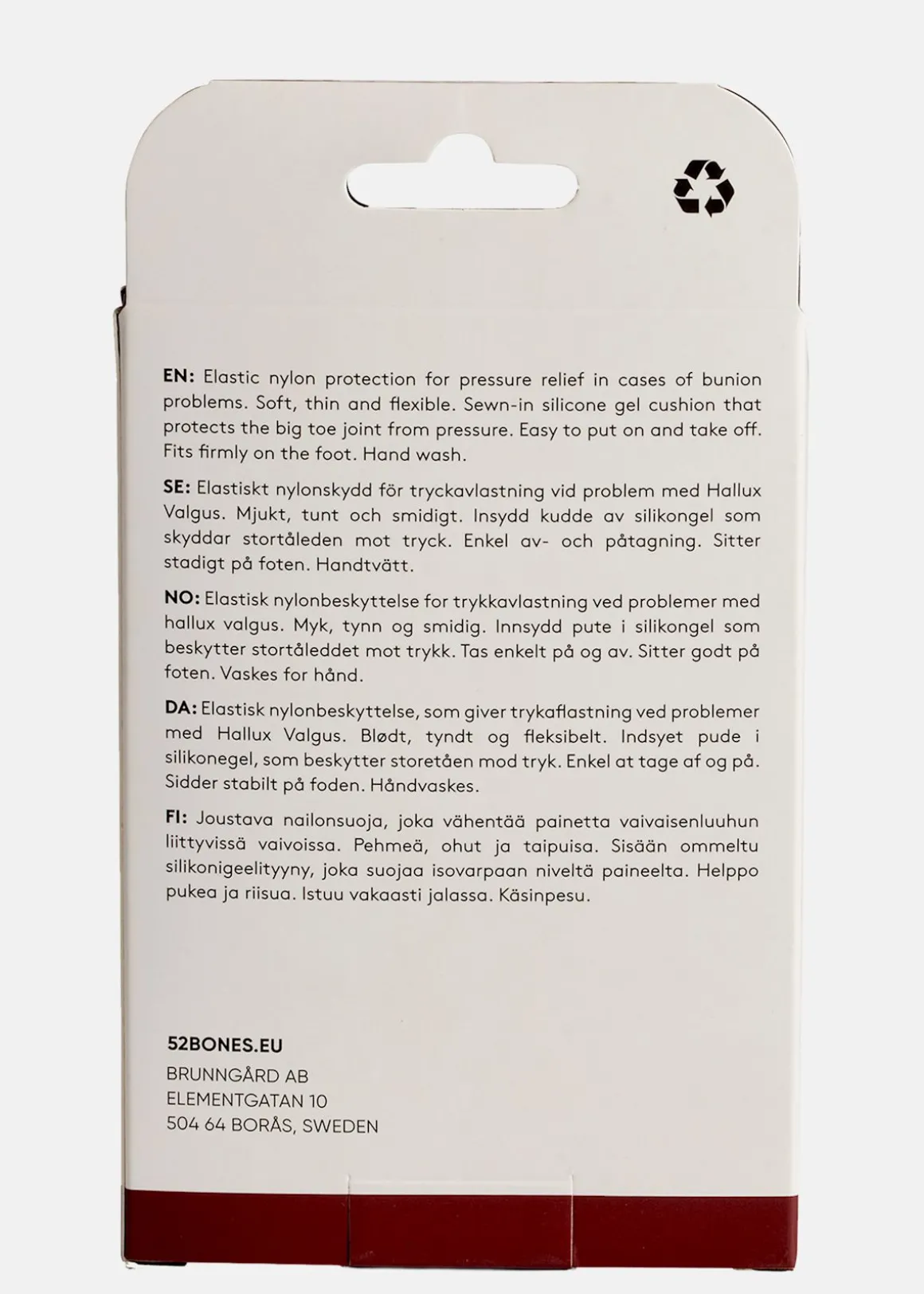 Bunion Protect från 52 Bones är ett elastiskt nylon-skydd som enkelt lindrar besvär orsakade av Hallux Valgus. Det mjuka skyddet har en insydd kudde av silikongel som effektivt tryckavlastar stortåleden. Enkelt att sätta på och ta av, passar både vänster och höger fot, och sitter stadigt på plats för optimal komfort.
