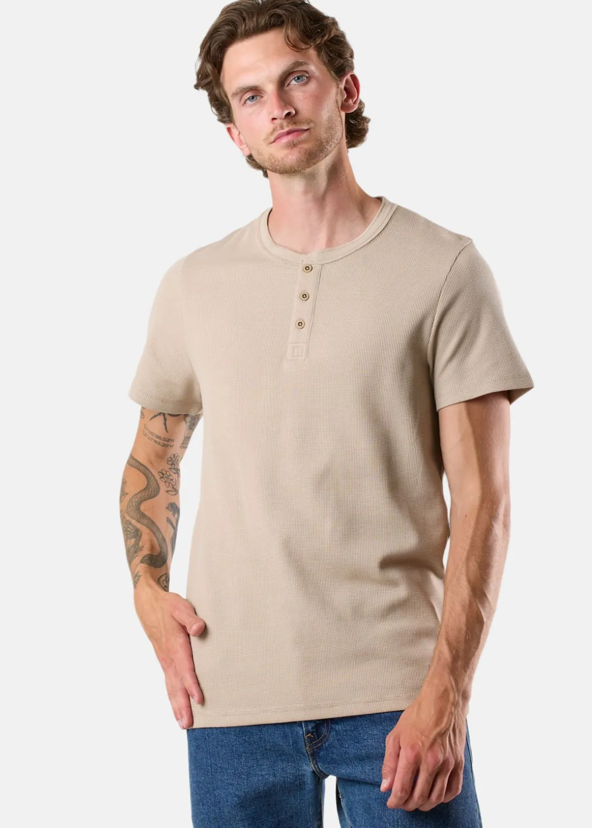 Upplev den ultimata komforten med vår Henley Tee från Denim Factory. Denna klassiska kortärmade farfarströja är tillverkad i mysig våfflad trikå. Dess rymliga och bekväma passform, tillsammans med en snygg rund halskant med tre knappar, ger en mångsidig utstrålning som passar till såväl avslappnade som lite mer dressade tillfällen. Bär den med ditt favoritpar jeans eller med chinos för en snygg, avslappnad stil. Ge din garderob ett lyft med Henley Tee – den perfekta kombinationen av komfort och stil.