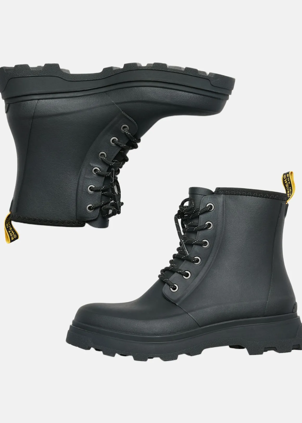 Milo gummistövel är en stilren och funktionell herrsko som är handtillverkad av FSC®-certifierat naturligt gummi. Den är designad för att vara både vattentät och hållbar, vilket gör den idealisk för både stadsmiljöer och mer utmanande terräng. Med ett snabbtorkande 3D-air mesh-foder och en stabil konstruktion med metallskärva, erbjuder skon både komfort och stöd. Yttersulan ger utmärkt grepp, och de reflekterande skosnörena ökar synligheten i svagt ljus. Med extra skosnören i klassisk gul färg kan du enkelt variera din stil.