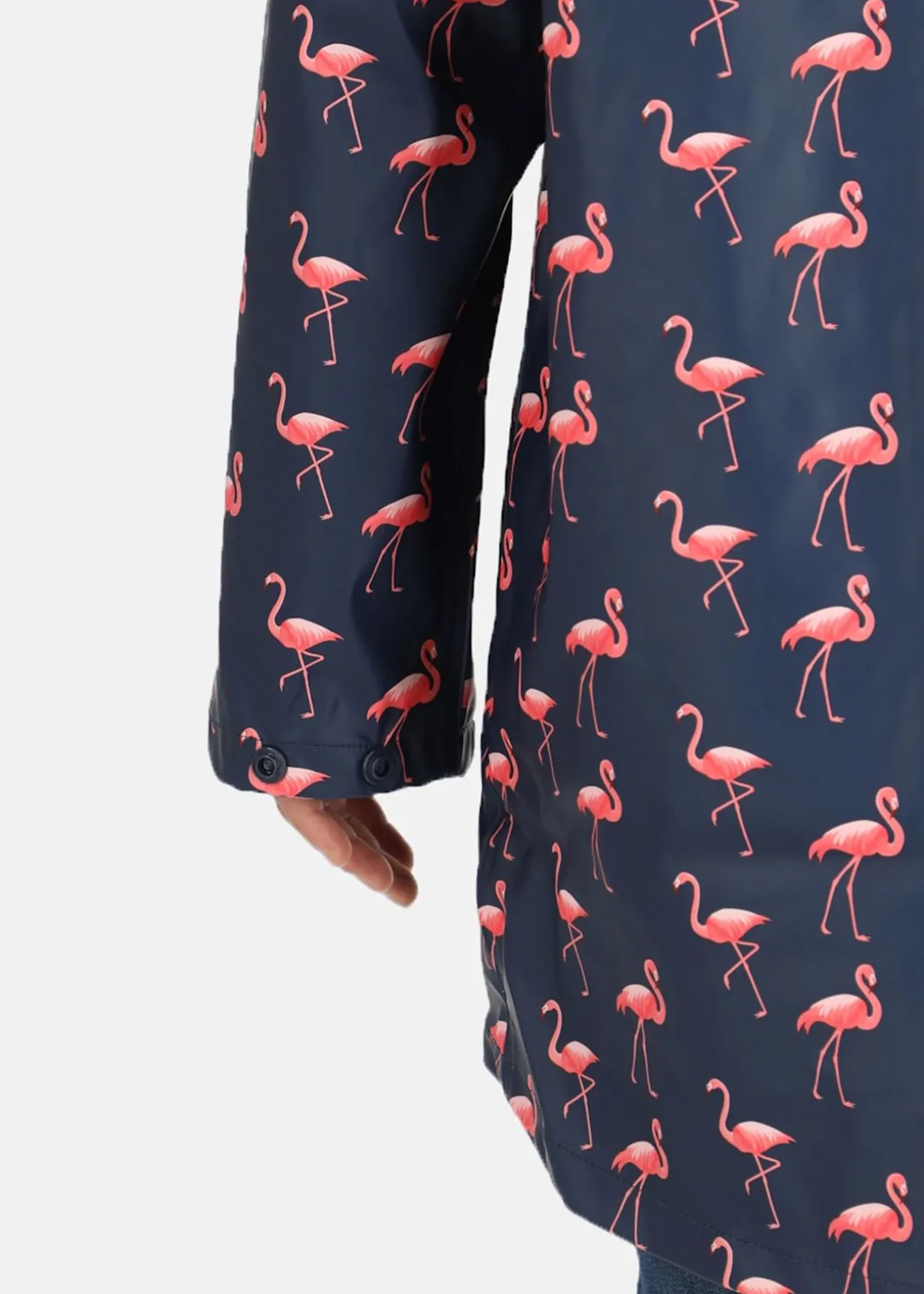 En regnkappa från Blount & Pool som både ger ett bra väderskydd och har en unik design. Materialet är vind- och vattentätt och har även tejpade sömmar för att försäkra att vatten inte tränger sig in. Kappan är medel-lång för att täcka en större yta av kroppen när det regnar. Hög krage med luva som kan justeras i vidd med dragsnören, två snedställda sidofickor som förseglas med knapp och justerbara ärmslut. Ett logotryck på bröstet och tryckknappar längs hela öppningen. Välj bland märkets härliga mönster med ankor, flamingos eller ananaser!