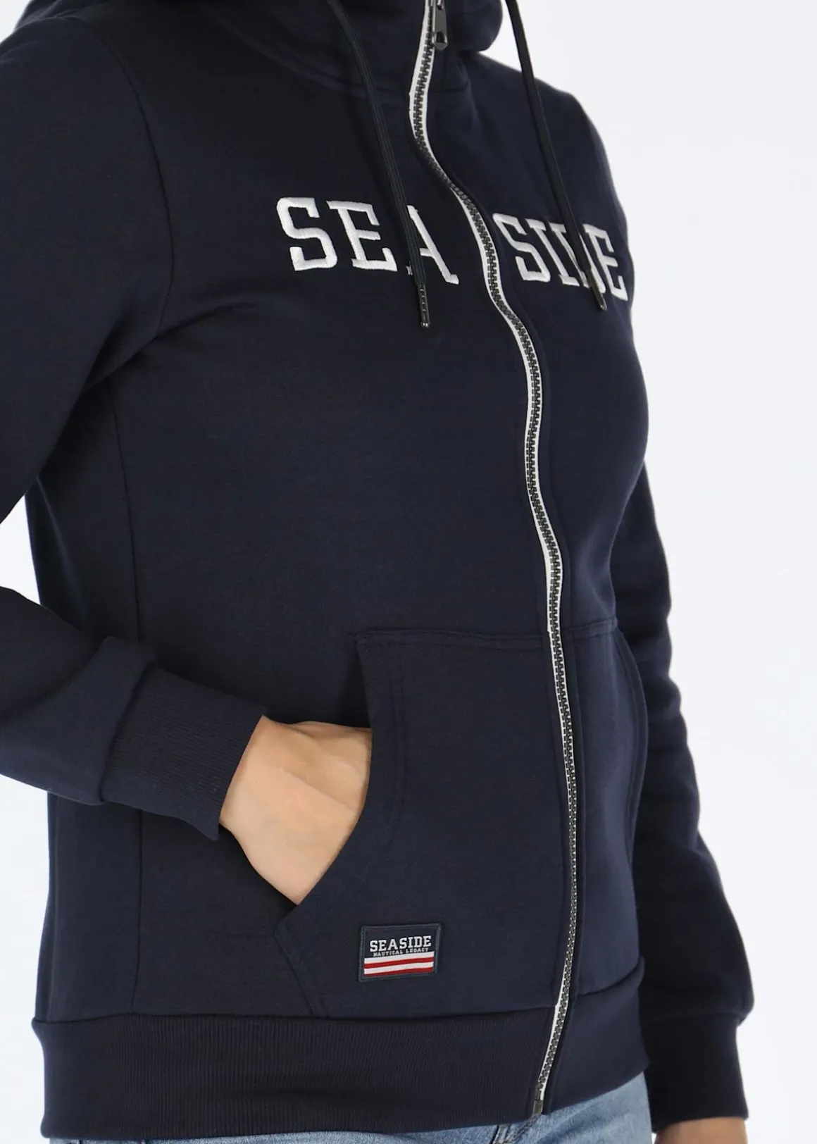 Nautical Zip Hood W från Seaside är en stilren huvtröja i mjukt och elastiskt material med normal passform. Med broderat logotryck på bröstet, logopatch på axeln och delad känguruficka är denna huvtröja perfekt för både vardag och fritid. Justerbar huva, hellång dragkedja, mudd vid ärmsluten och nedtill ger extra komfort och skydd mot kylan. Den borstade insidan gör att den känns mjuk och skön mot huden. Upptäck hur enkel och bekväm din stil kan vara samtidigt som du ser fantastisk ut!