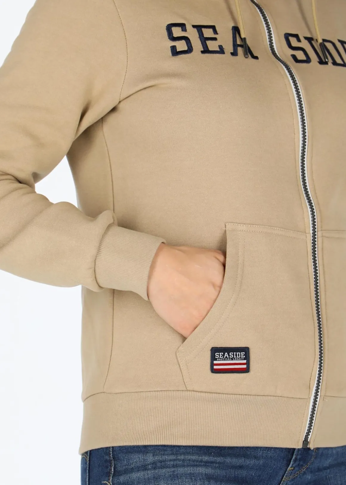 Nautical Zip Hood W från Seaside är en stilren huvtröja i mjukt och elastiskt material med normal passform. Med broderat logotryck på bröstet, logopatch på axeln och delad känguruficka är denna huvtröja perfekt för både vardag och fritid. Justerbar huva, hellång dragkedja, mudd vid ärmsluten och nedtill ger extra komfort och skydd mot kylan. Den borstade insidan gör att den känns mjuk och skön mot huden. Upptäck hur enkel och bekväm din stil kan vara samtidigt som du ser fantastisk ut!