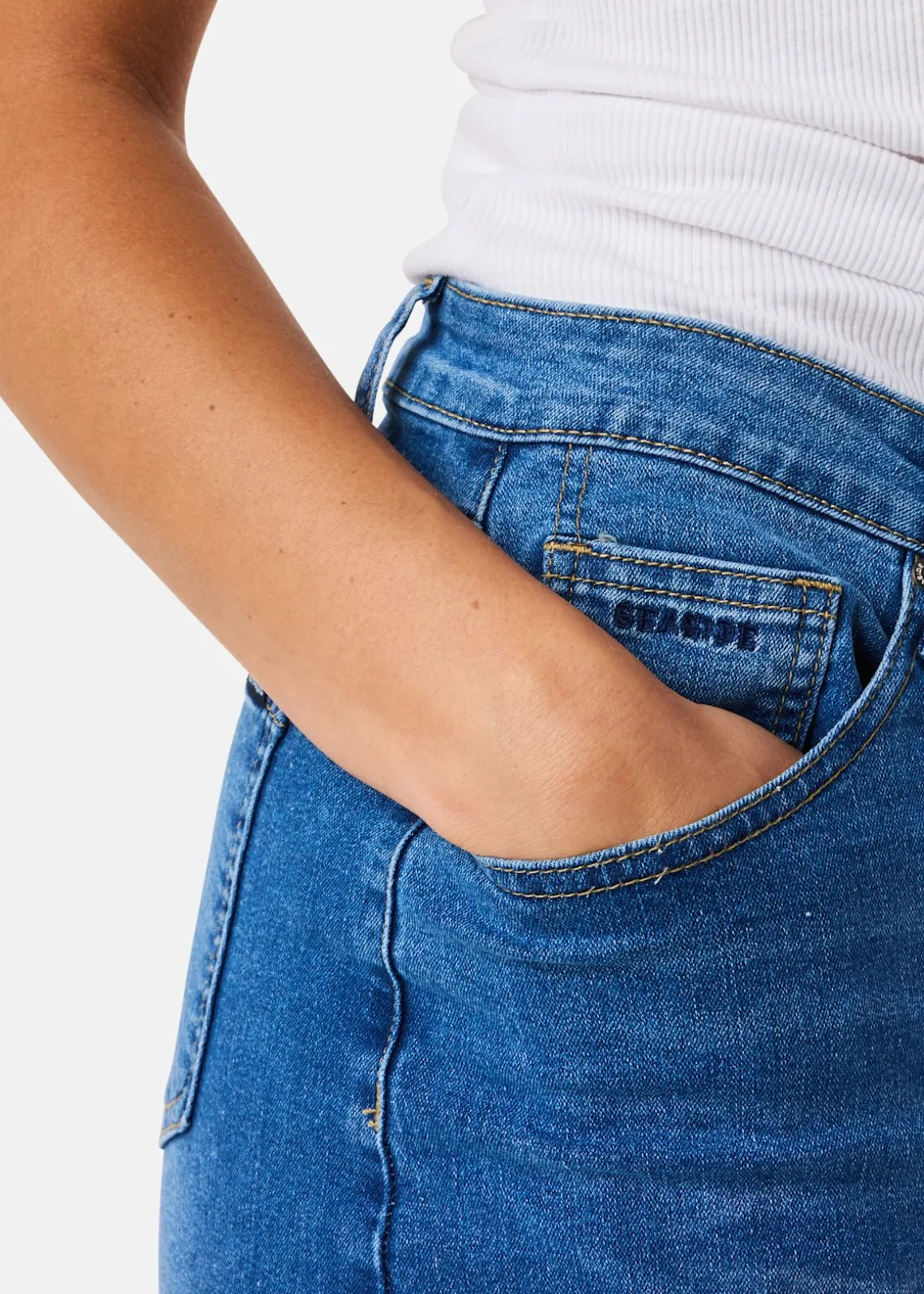 Denna jeanskjol är en tidlös klassiker med fem fickor och bekvämt stretchigt material. Kjolen har hällor, slitsar i sidorna och en gylf med knapp och dragkedja. Seaside-loggan pryder ena bakfickan. Perfekt att matcha med allt, denna kjol är både stilren och funktionell. Materialet består av 98% bomull och 2% elastan, vilket ger en skön passform.