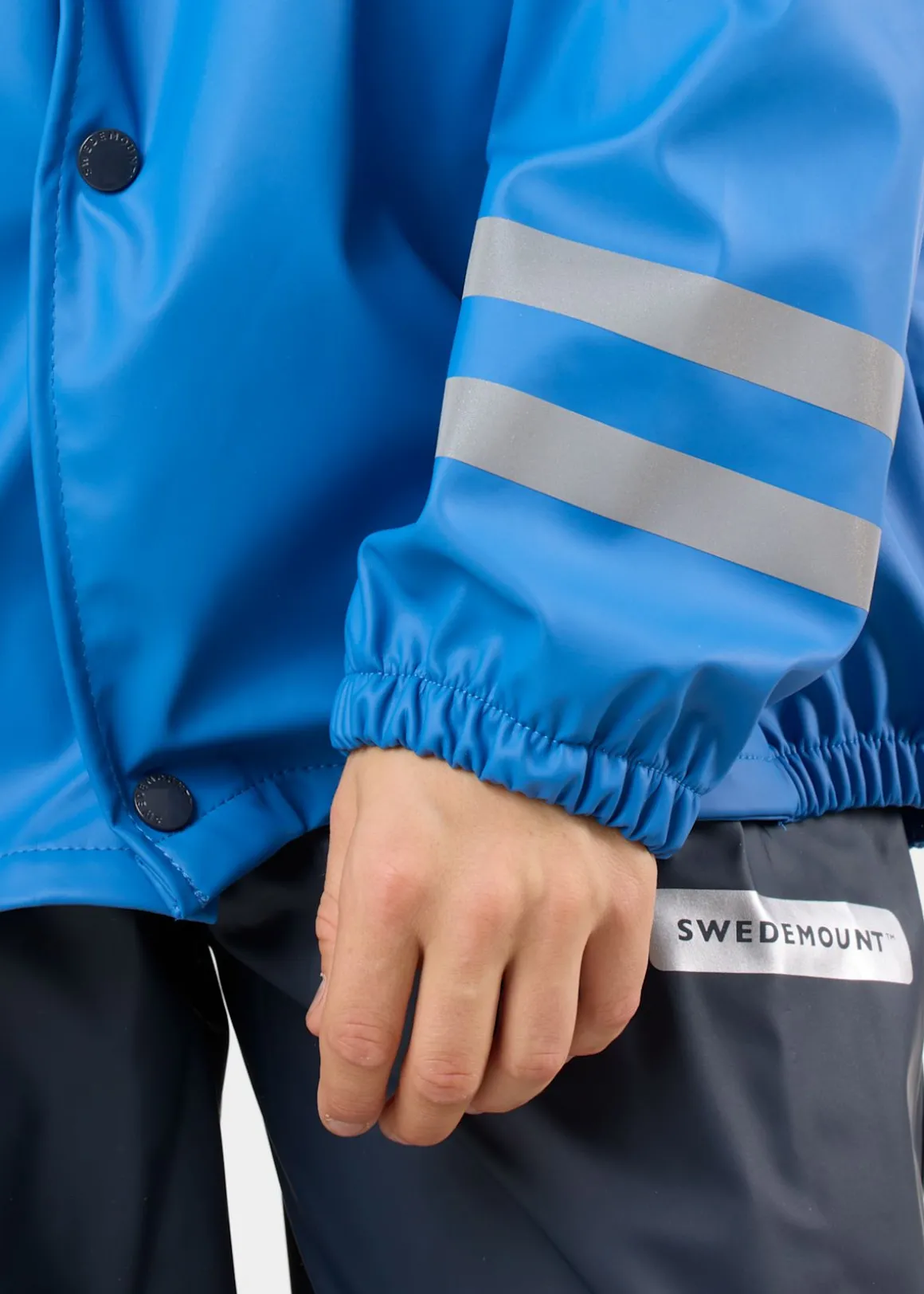 Regnställ från Swedemount i ett vind- och vattentätt material. Regnjackan har en hellång knappstängning och avtagbar huva för säkerhet och bekvämlighet. Regnbyxorna har justerbara hängslen och elastiska fothällor i silikon. Redo för alla väder med fullständigt skydd.