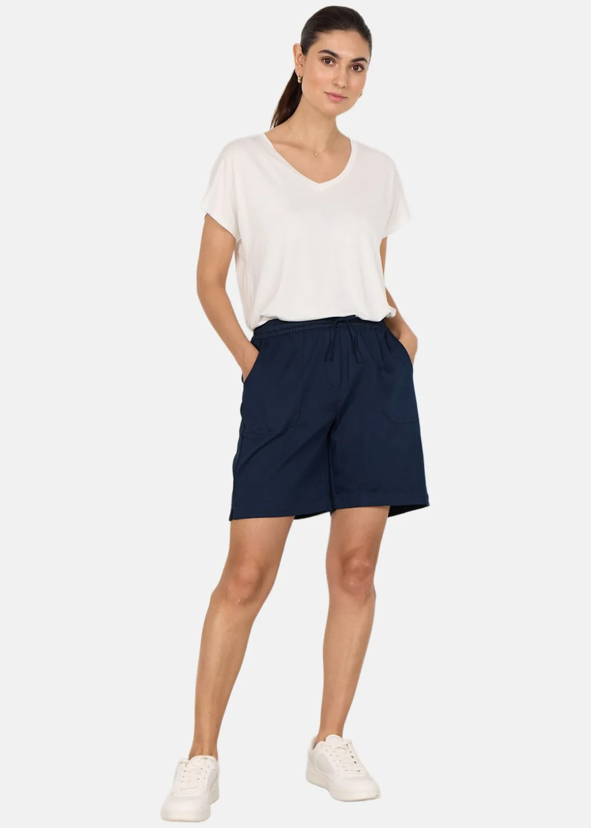SC-Akila 24-c shorts är perfekta för varma dagar. De kombinerar komfort och stil med sin elastiska midja och justerbara dragsko. Fyra stora fickor ger praktisk förvaring, medan den baggy passformen ger en avslappnad känsla. Tillverkade i en blandning av bomull och polyester, är de både hållbara och bekväma. Kombinera med en mönstrad blus för en trendig look.