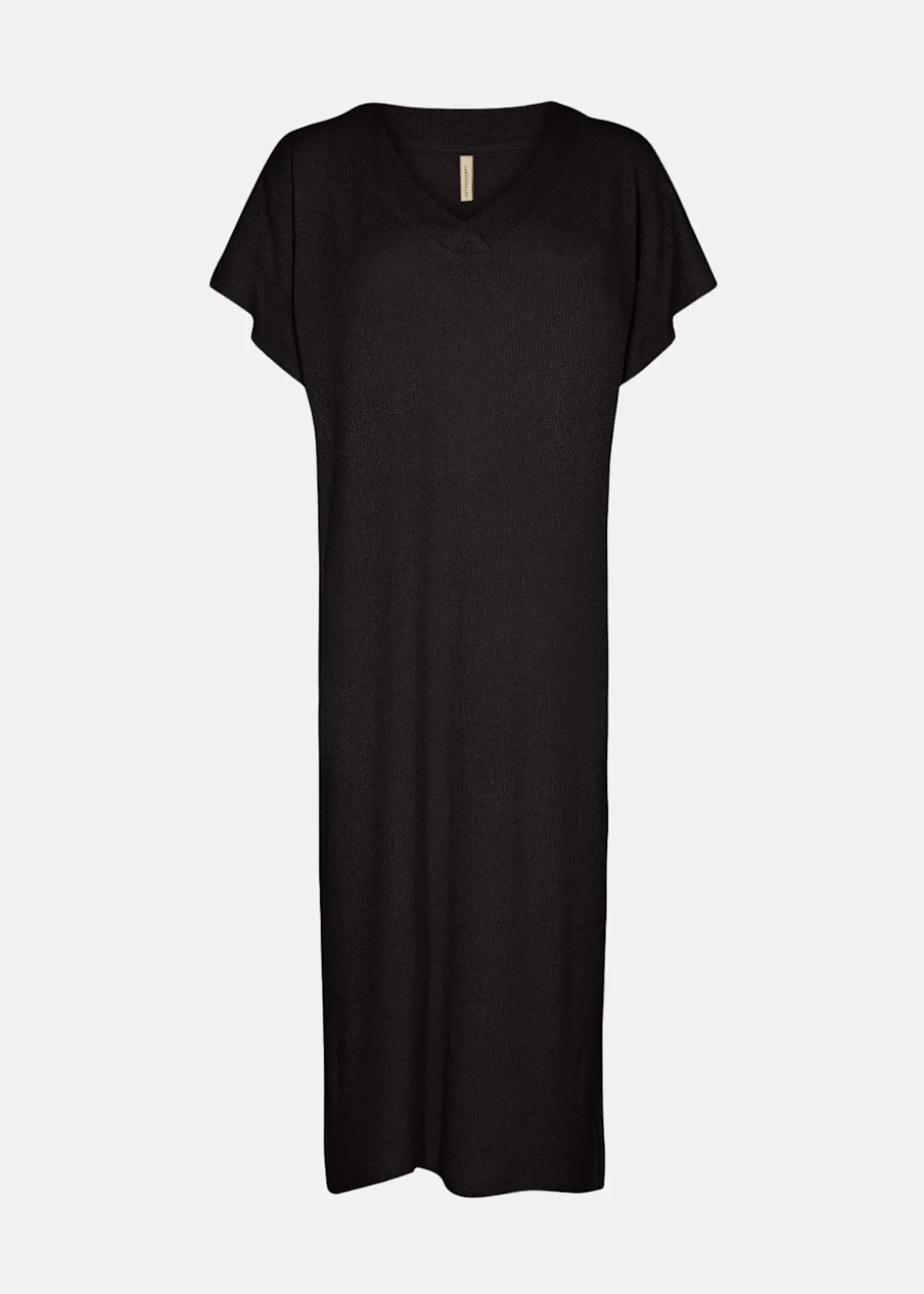 Mjuk och stretchig klänning som ger en bekväm känsla hela dagen. V-ringningen och de korta ärmarna ger klänningen en trendig touch, medan sidoslitsarna hjälper till att skapa en luftig känsla. Det här är helt klart en garderobsfavorit för enkel och elegant vardagsstil.
