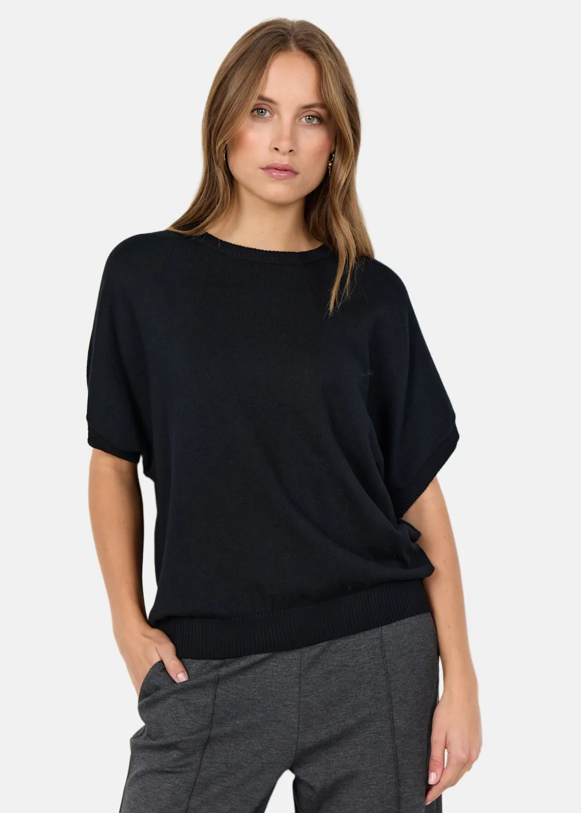 En mjuk tröja i viskosmix med korta ärmar och klassisk krage. Den rundade halsringningen och ribbade nederkanten ger en avslappnad men välklädd silhuett. Perfekt att bära som den är eller under en kavaj – enkel att matcha med både jeans och skräddade byxor.