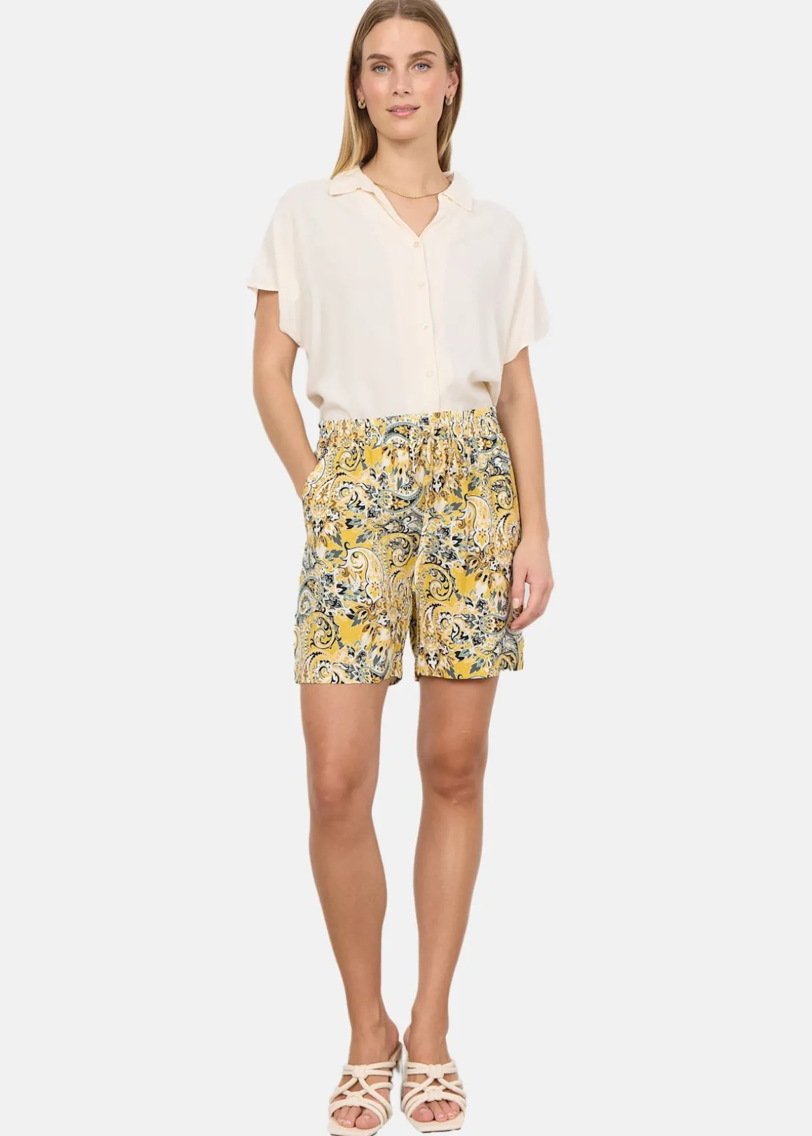 Sc-Esin 1-B från Soya Concept är de perfekta sommarshorts. Med sin elastiska midja och justerbara knytband är de både bekväma och perfekta för en dag på stranden eller en kvällspromenad. Dessutom har de ett unikt och färgglatt mönster som verkligen kommer att sticka ut. Tillverkade i ett tunt och lätt material är de också svala och luftiga. Missa inte chansen att få tillföra lite färg och stil till din garderob med dessa fantastiska shorts!