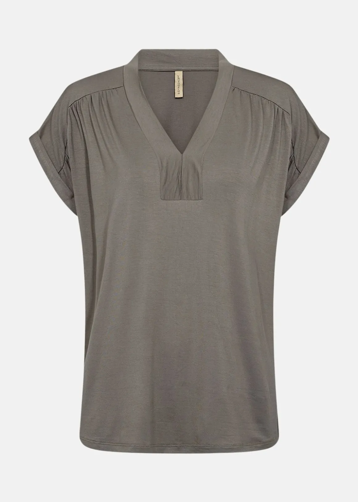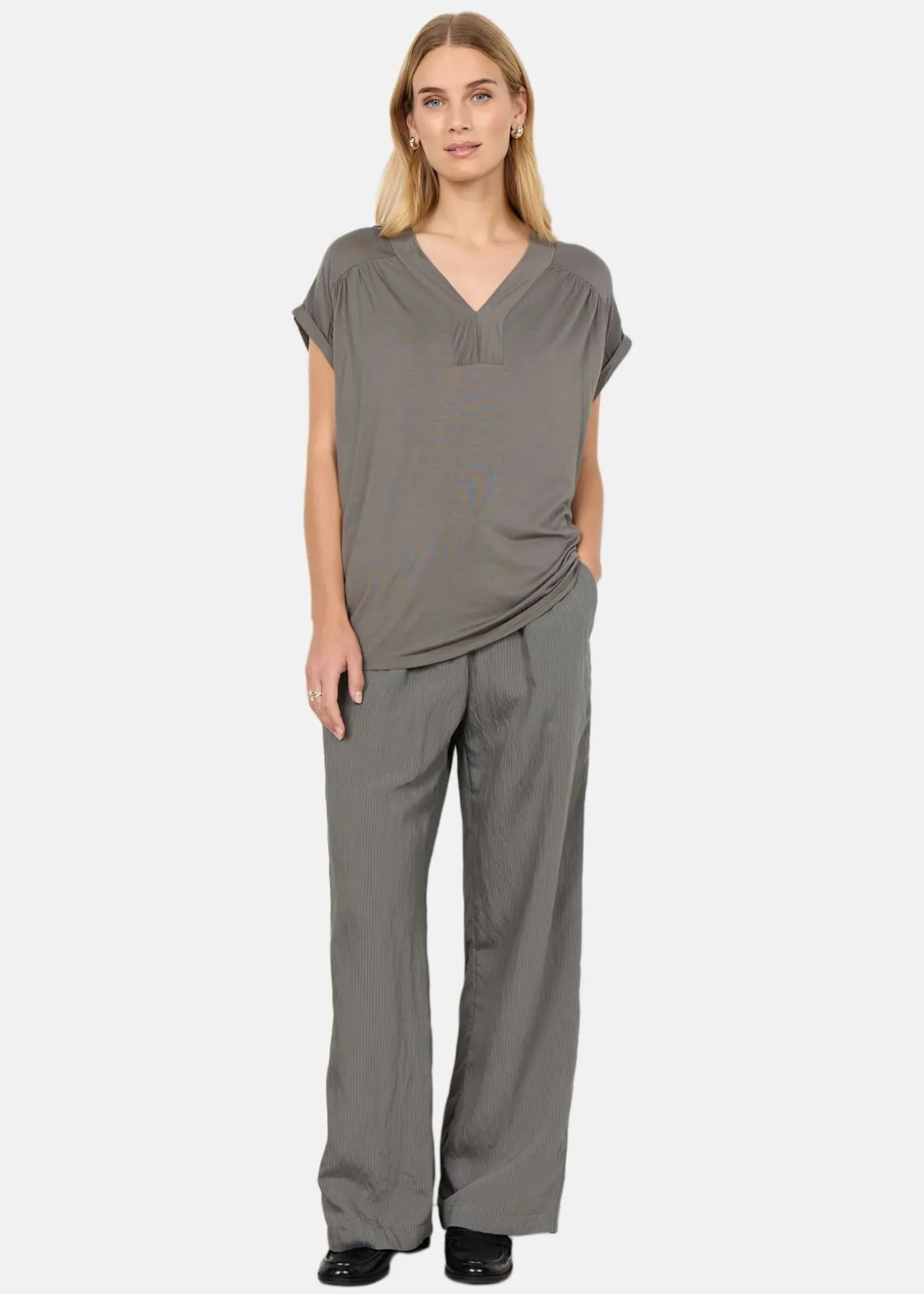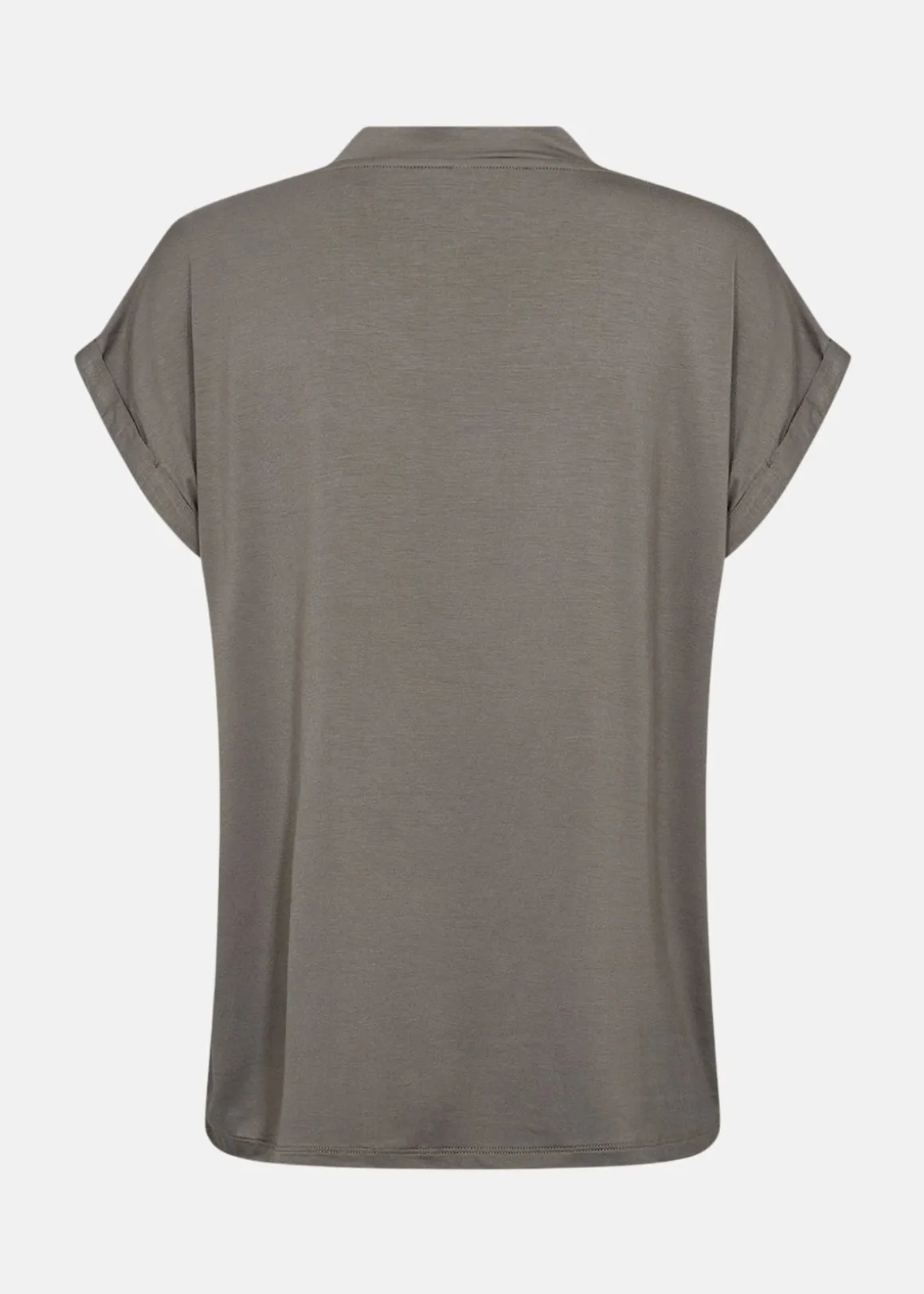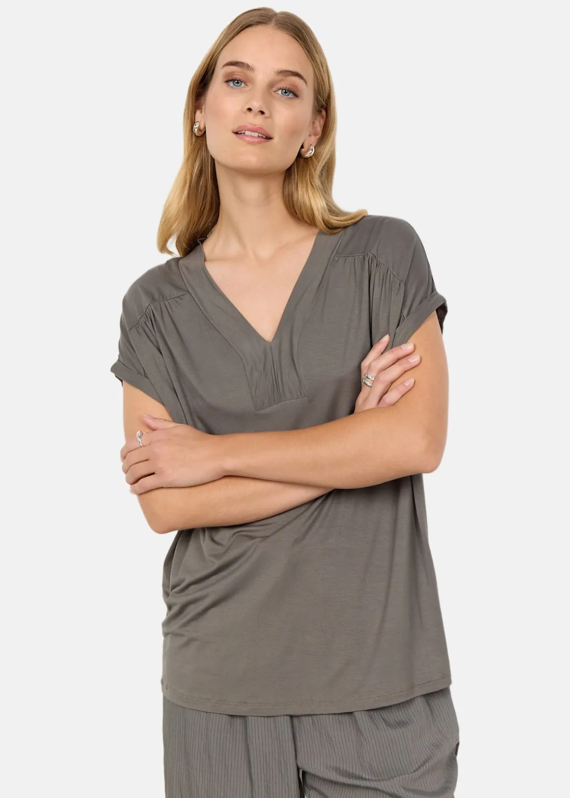 Denna t-shirt erbjuder en stilren och bekväm design med sin feminina v-ringning och korta uppkavlade ärmar. Den lösa passformen gör den perfekt för avslappnade dagar, medan materialblandningen av Lyocell och Elastan ger en mjuk och stretchig känsla. Kombinera med jeans och en tunn kofta för en komplett och trendig outfit.