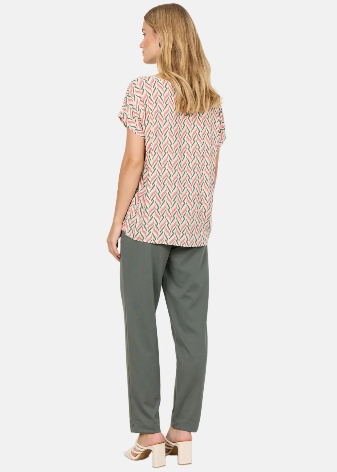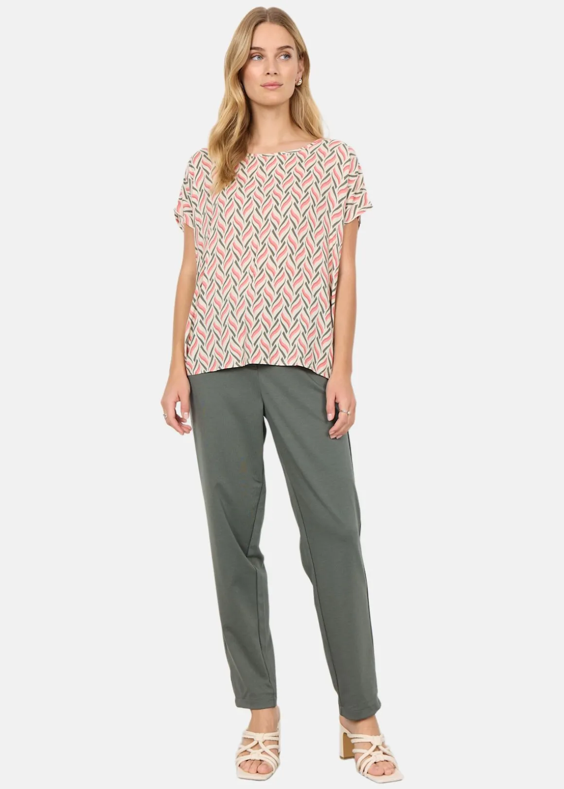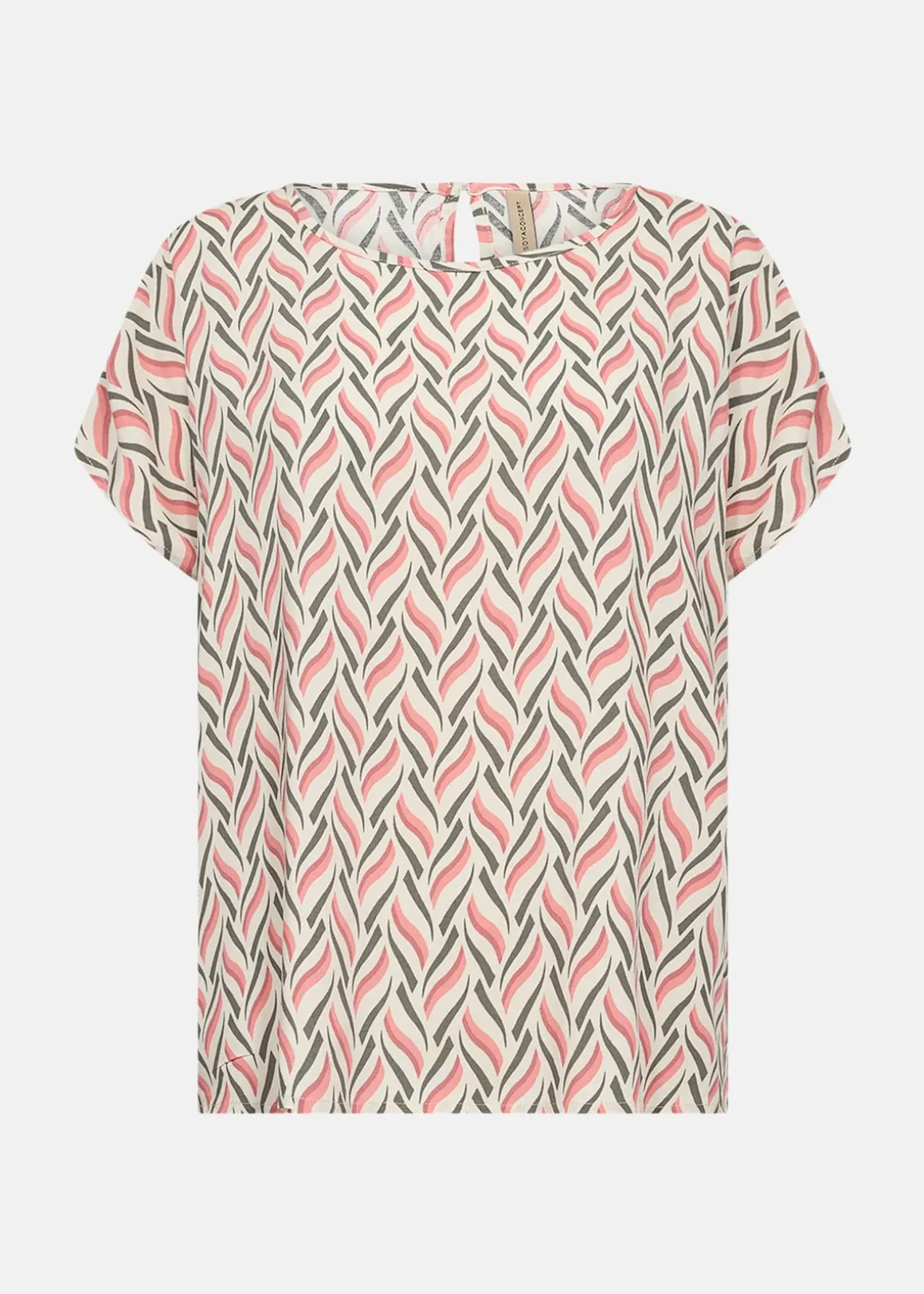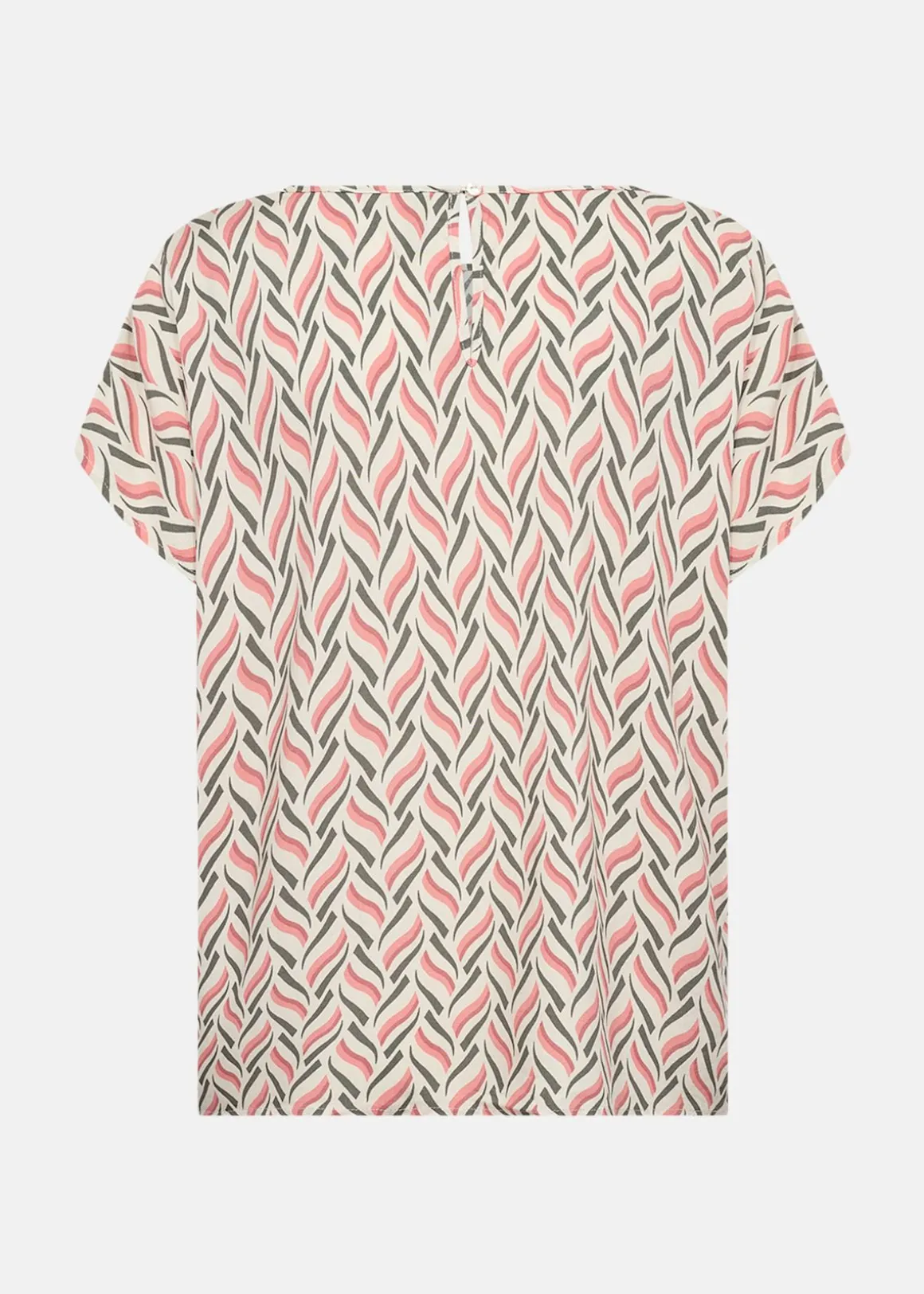 Denna blus erbjuder en stilfull kombination av modern design och komfort. Med sitt unika abstrakta tryck och korta ärmar är den perfekt för både vardag och fest. Den runda halsringningen och knappstängningen baktill ger en elegant touch. Tillverkad av 100% LENZING ECOVERO viskos, vilket garanterar en mjuk och hållbar känsla. Kombinera med skräddarsydda byxor eller en kjol för en smart och mångsidig look.