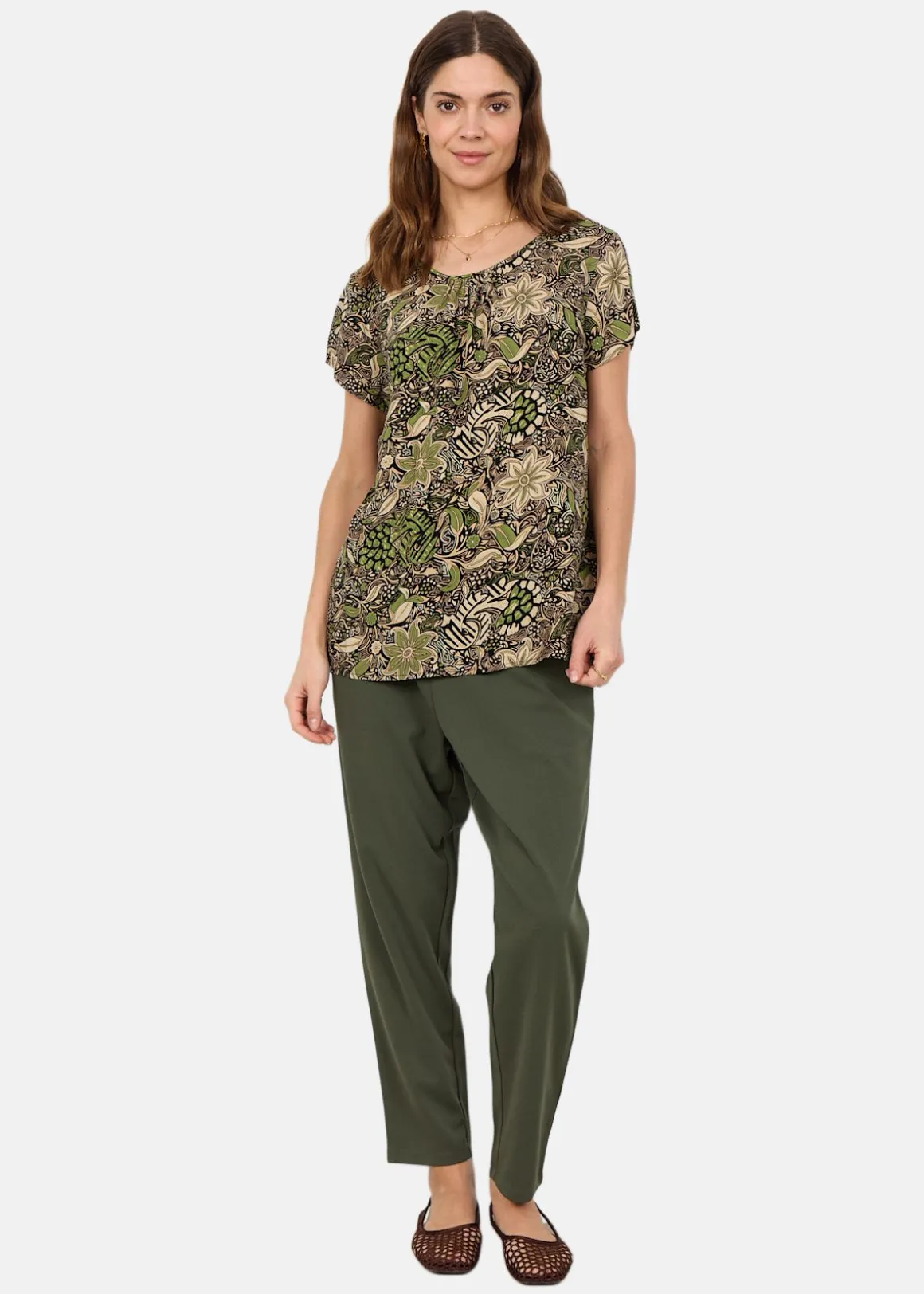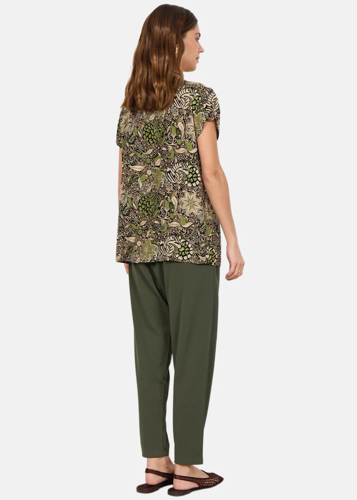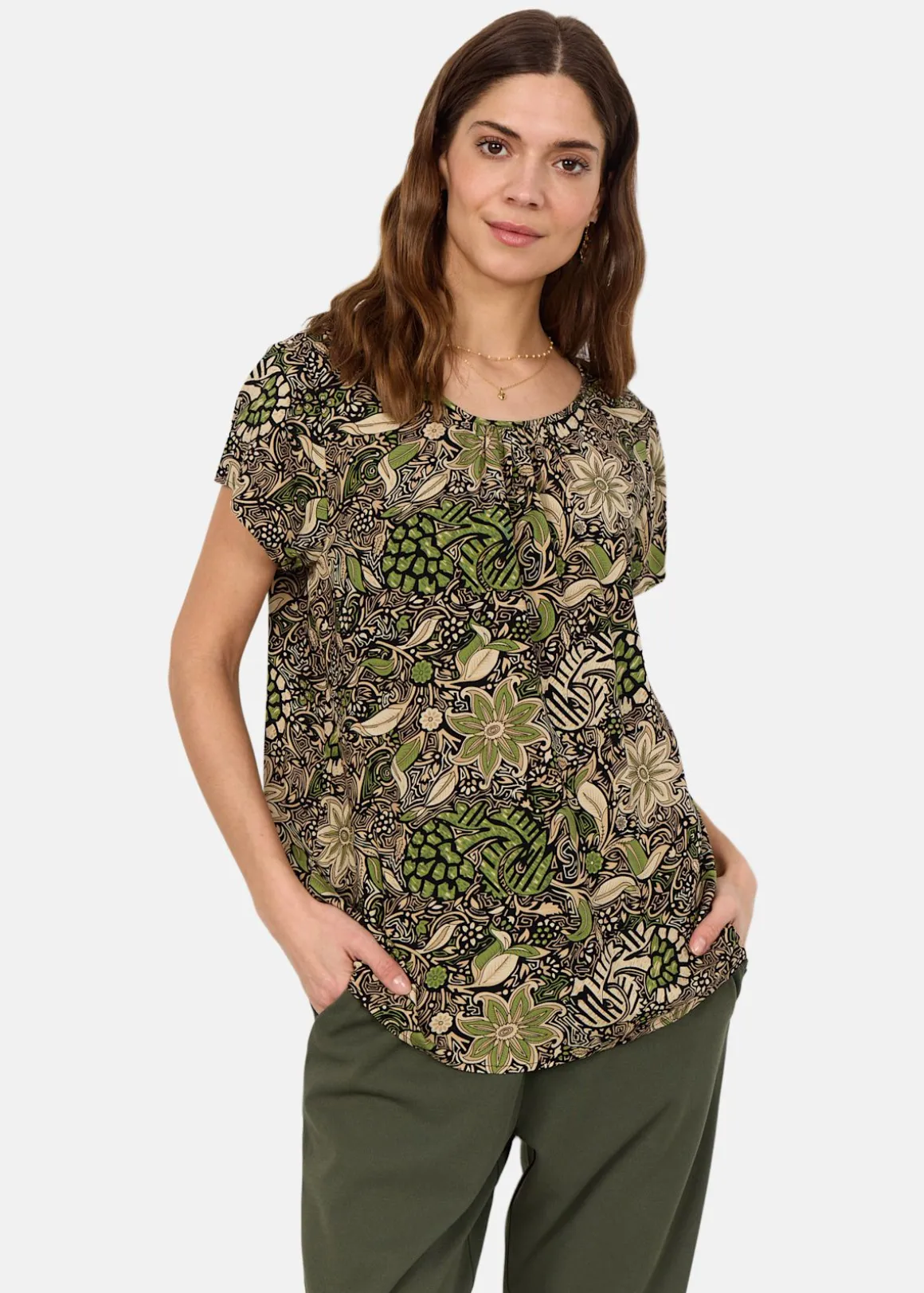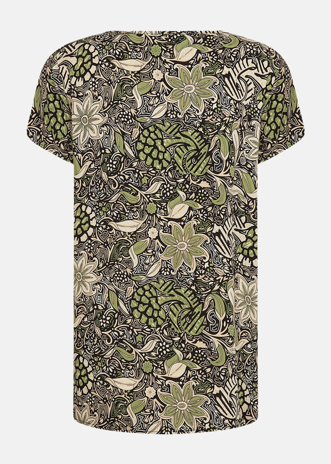 Denna topp erbjuder en stilren design med en rundad halsringning och korta ärmar, vilket gör den till ett mångsidigt plagg. Det detaljerade allover-mönstret ger en unik touch, medan materialet i 100% LENZING ECOVERO viskos säkerställer komfort och hållbarhet. Perfekt att kombinera med skräddarsydda byxor eller en kjol för en smart och avslappnad look.