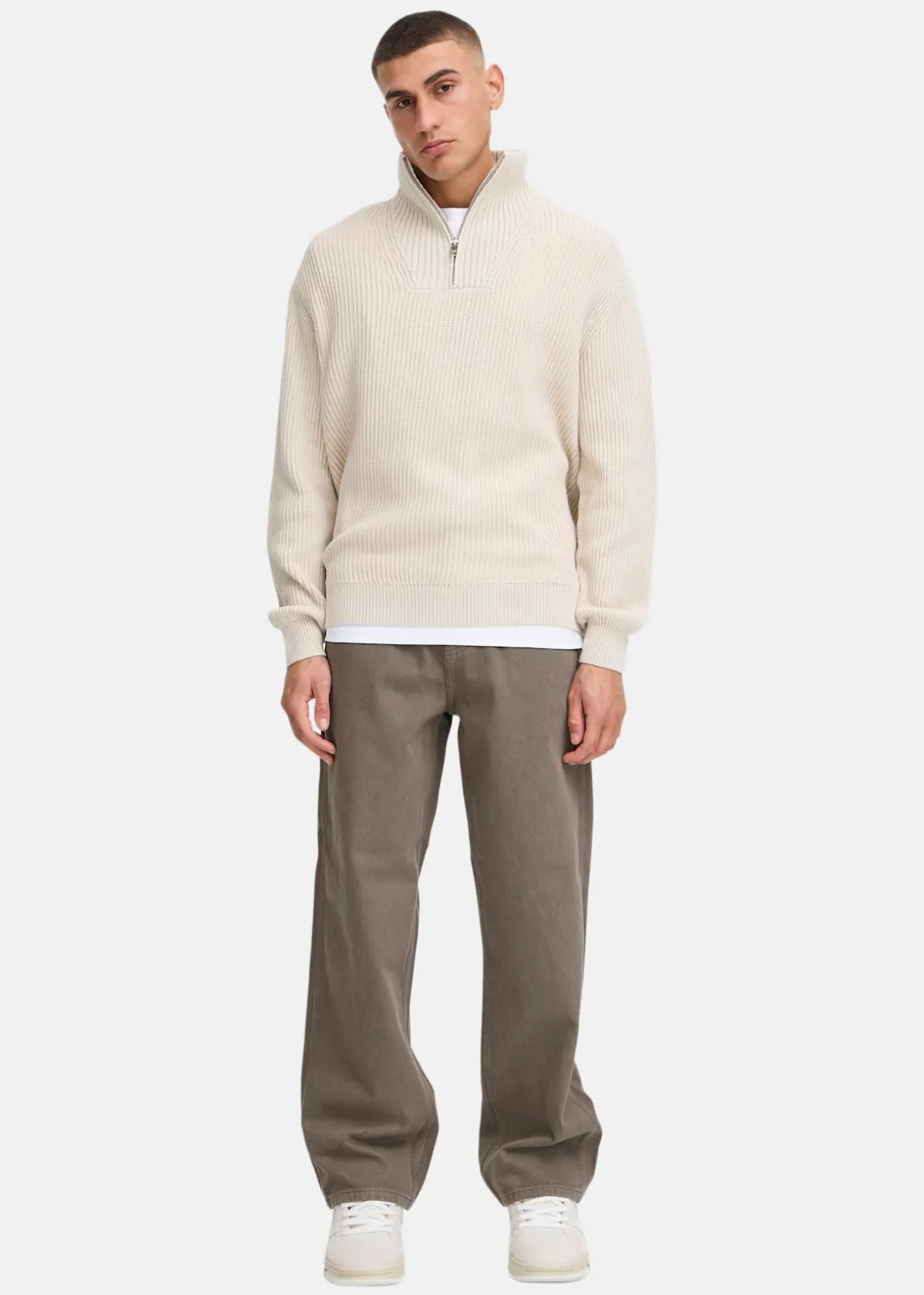 Den här tröjan i 100 % bomull har en avslappnad cocoon-siluett med lös passform – perfekt för lediga dagar. Den mjuka stickade strukturen gör den bekväm att bära, medan den höga kragen med dragkedja ger både stil och funktion.