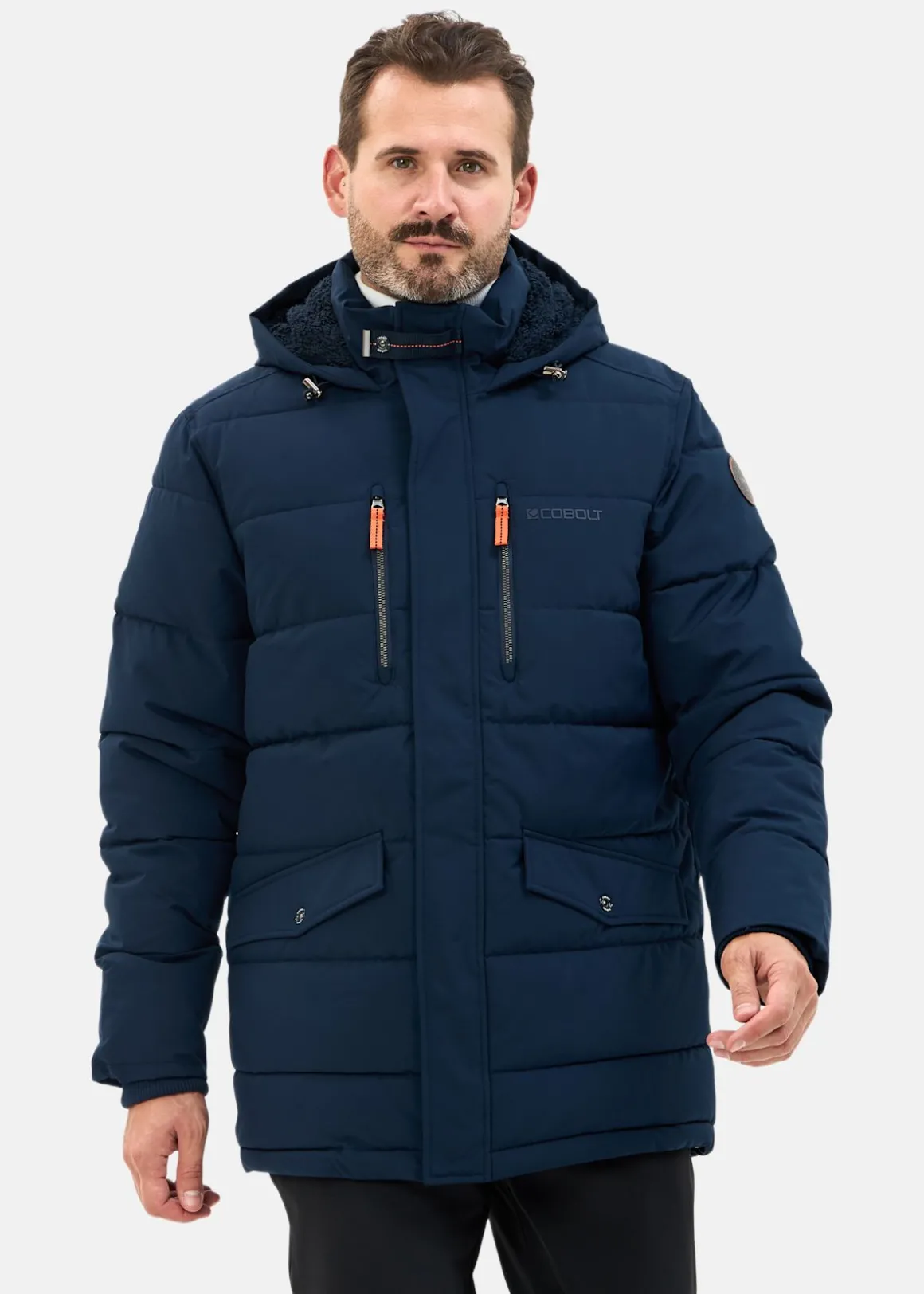 Den är vadderad med dunliknande polyester för skön värme och har en huva fodrad med mjuk pile för extra komfort. Praktiska fickor – två handfickor med lock, två bröstfickor samt en innerficka med dragkedja – ger gott om förvaring. Stickade muddar i ärmsluten och justerbar huva bidrar till en bra passform och värmehållning.