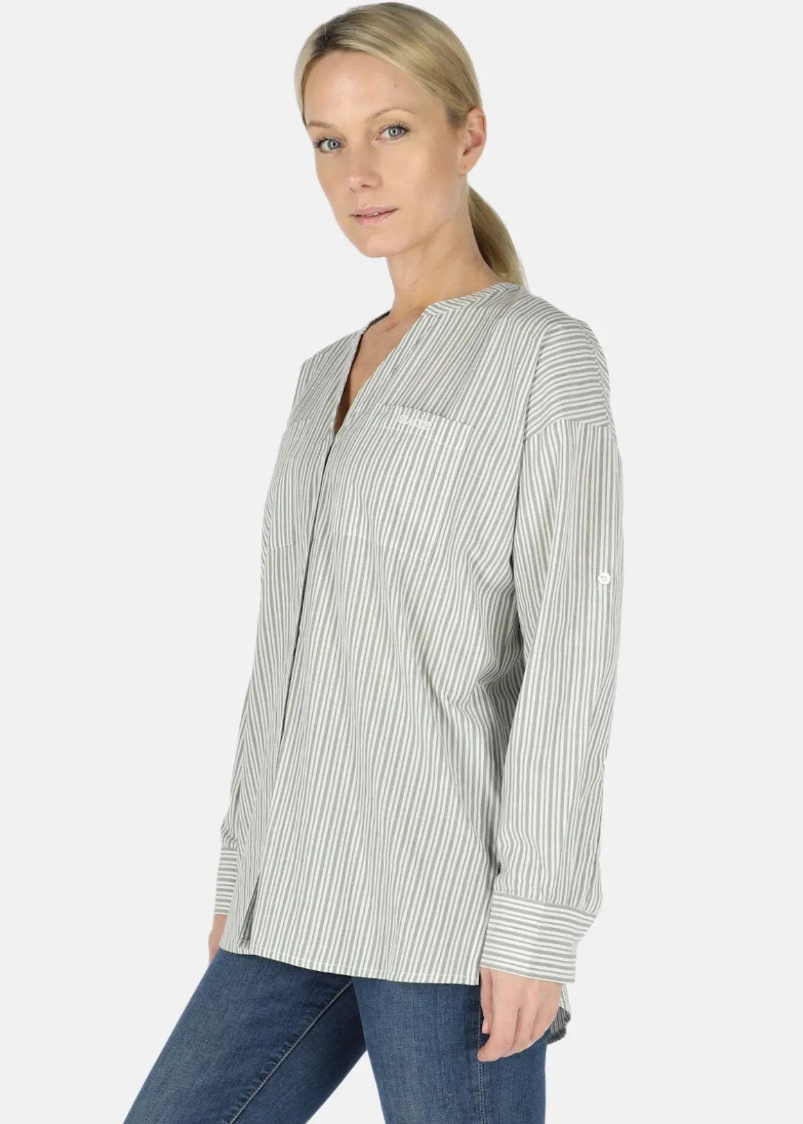 Uppvikbar ärm med knapp. Skön blus med en vacker design och ledig passform perfekt till vardags och finare tillfällen.