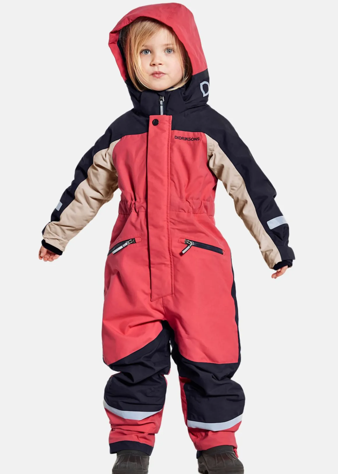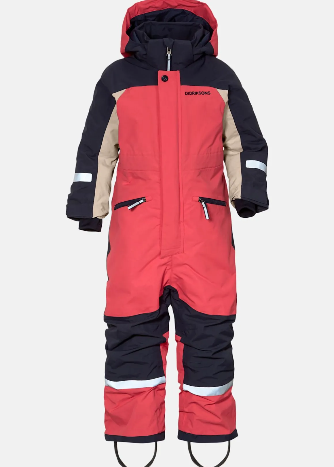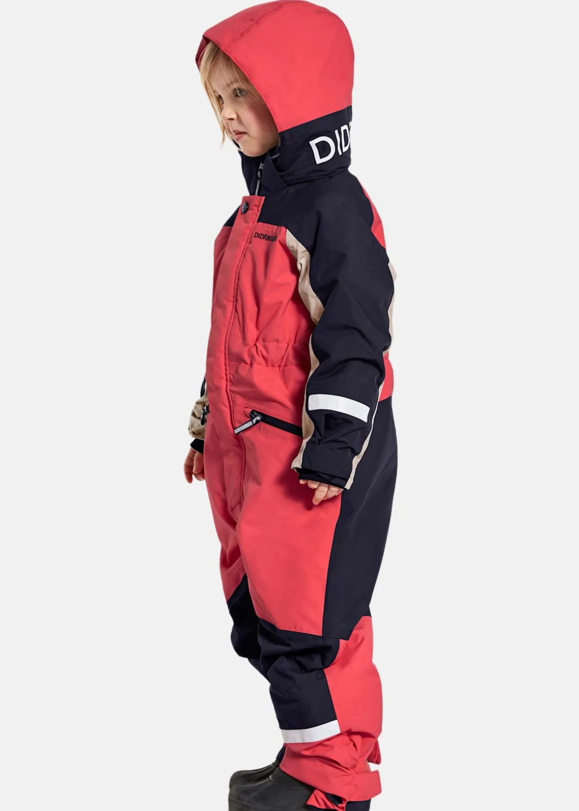 Vind- och vattentät overall med en huva och dragkedjestängning. Praktiska fickor och tumhål på muddarna. Reflekterande detaljer för bättre synlighet och fothällor i silikon. Används för att hålla plagget på plats.