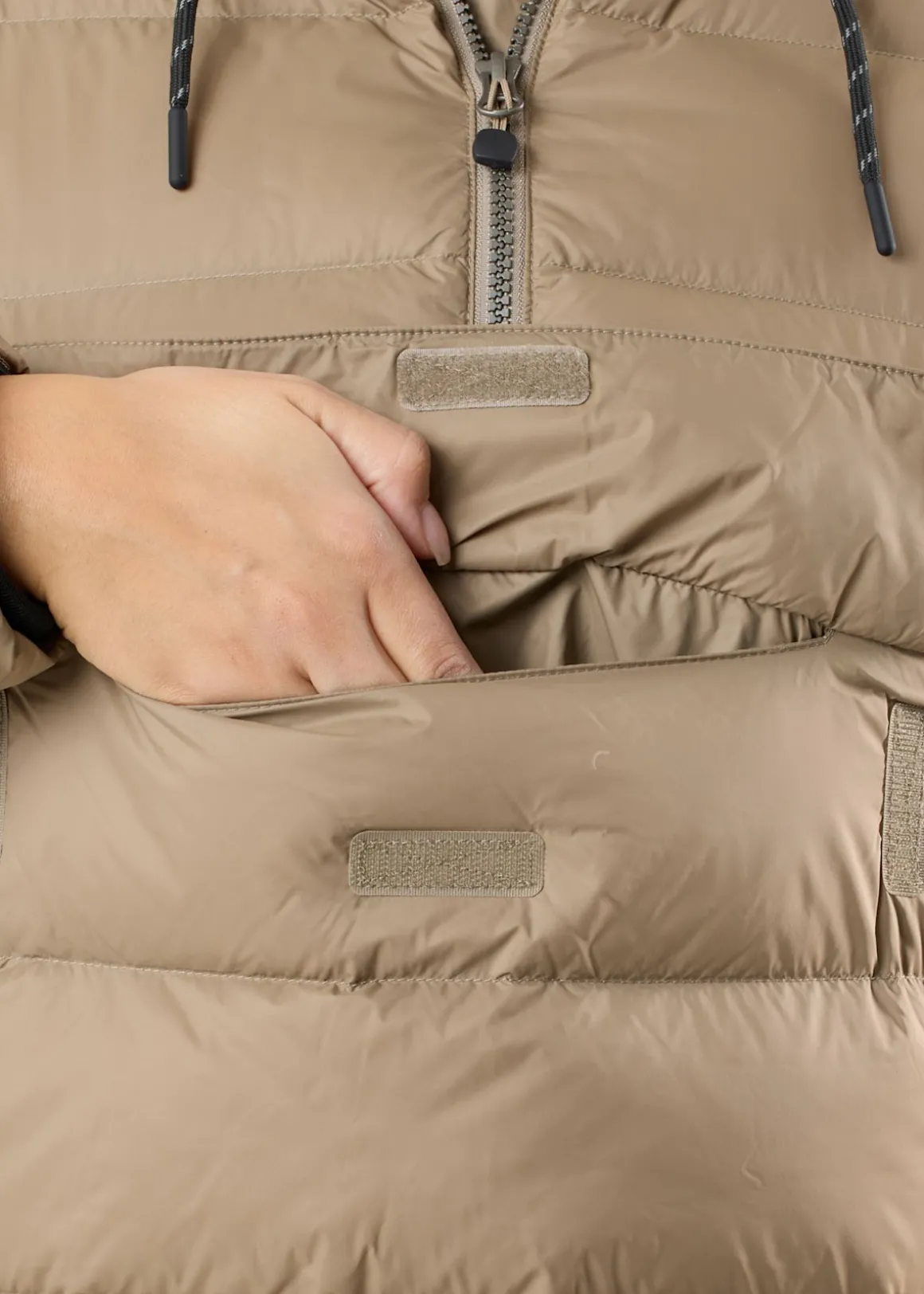 Annoraken har praktiska detaljer såsom justerbar huva, vind- och vattenavvisande material och en trekvartslång dragkedja är den både praktisk och snygg. Jackan har en ficka på magen och två handfickor med dragkedja för förvaring av småprylar. Knappstängningen på sidan gör den enkel att ta av och på. Med sina reflekterande detaljer ökar den också din synlighet i mörker..