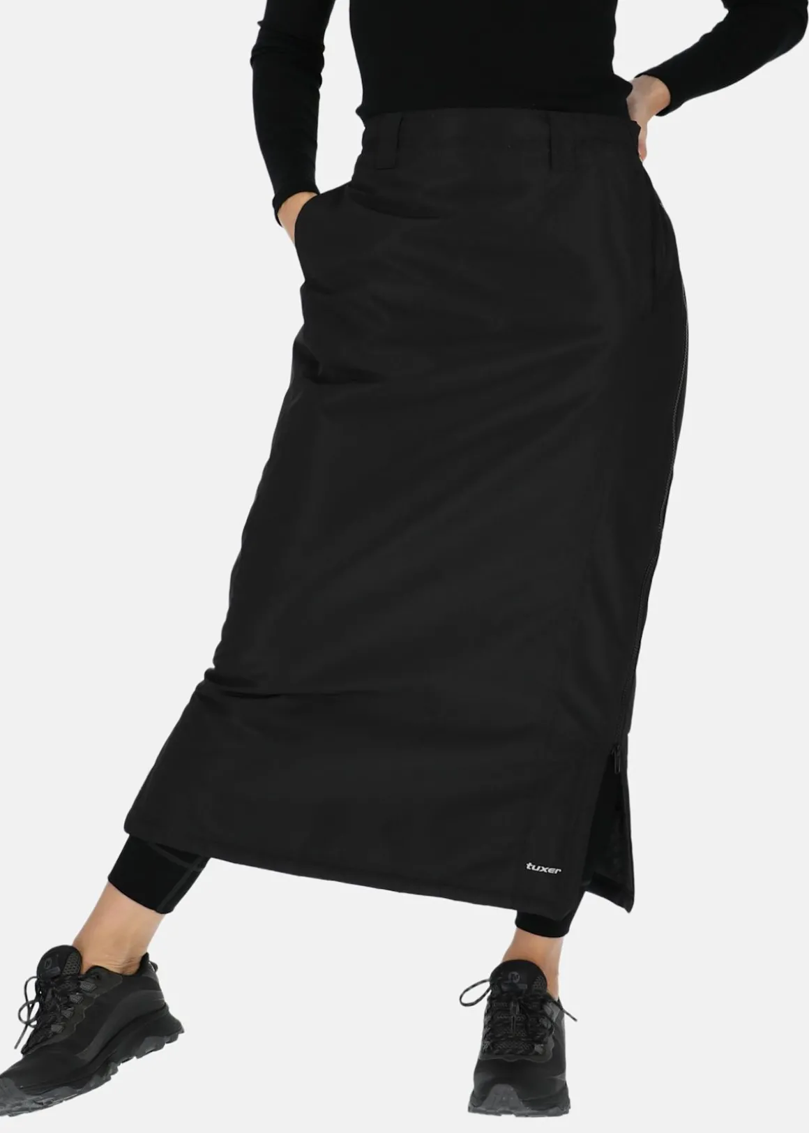 Sälen Skirt från Tuxer är en snygg och funktionell kjol för aktiva kvinnan. Tillverkad i vind- och vattenavvisande material håller den dig torr och bekväm oavsett väder. Kjolen har bälteshällor i midjan för en perfekt passform. Med den långa dragkedjan längs sidan gör det enkelt att ta av och på sig kjolen. En mångsidig kjol för promenader, vandring, utejobb eller andra aktiviteter utomhus!