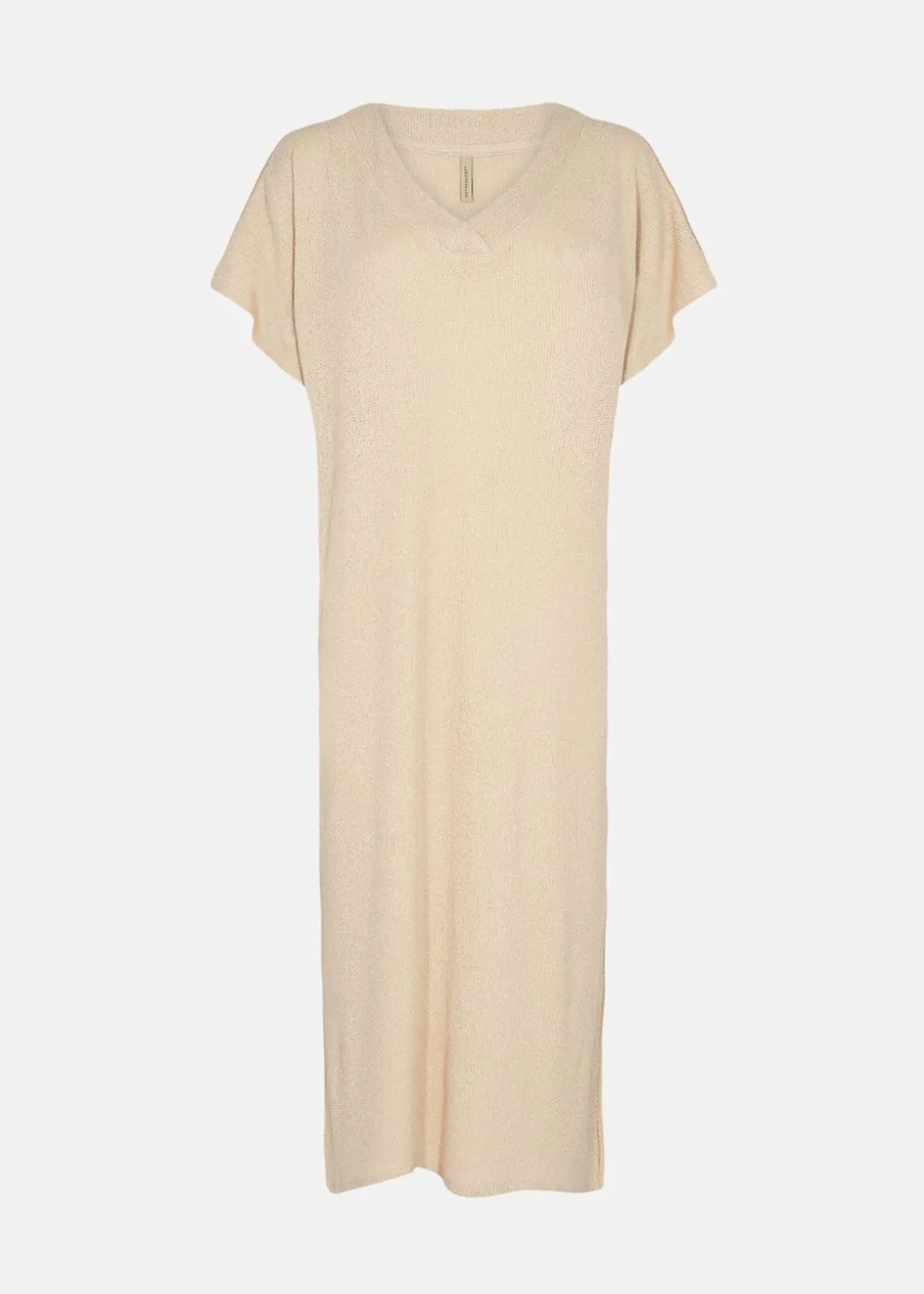 Mjuk och stretchig klänning som ger en bekväm känsla hela dagen. V-ringningen och de korta ärmarna ger klänningen en trendig touch, medan sidoslitsarna hjälper till att skapa en luftig känsla. Det här är helt klart en garderobsfavorit för enkel och elegant vardagsstil.