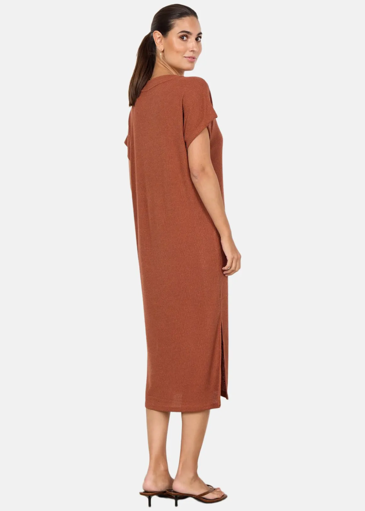 Mjuk och stretchig klänning som ger en bekväm känsla hela dagen. V-ringningen och de korta ärmarna ger klänningen en trendig touch, medan sidoslitsarna hjälper till att skapa en luftig känsla. Det här är helt klart en garderobsfavorit för enkel och elegant vardagsstil.