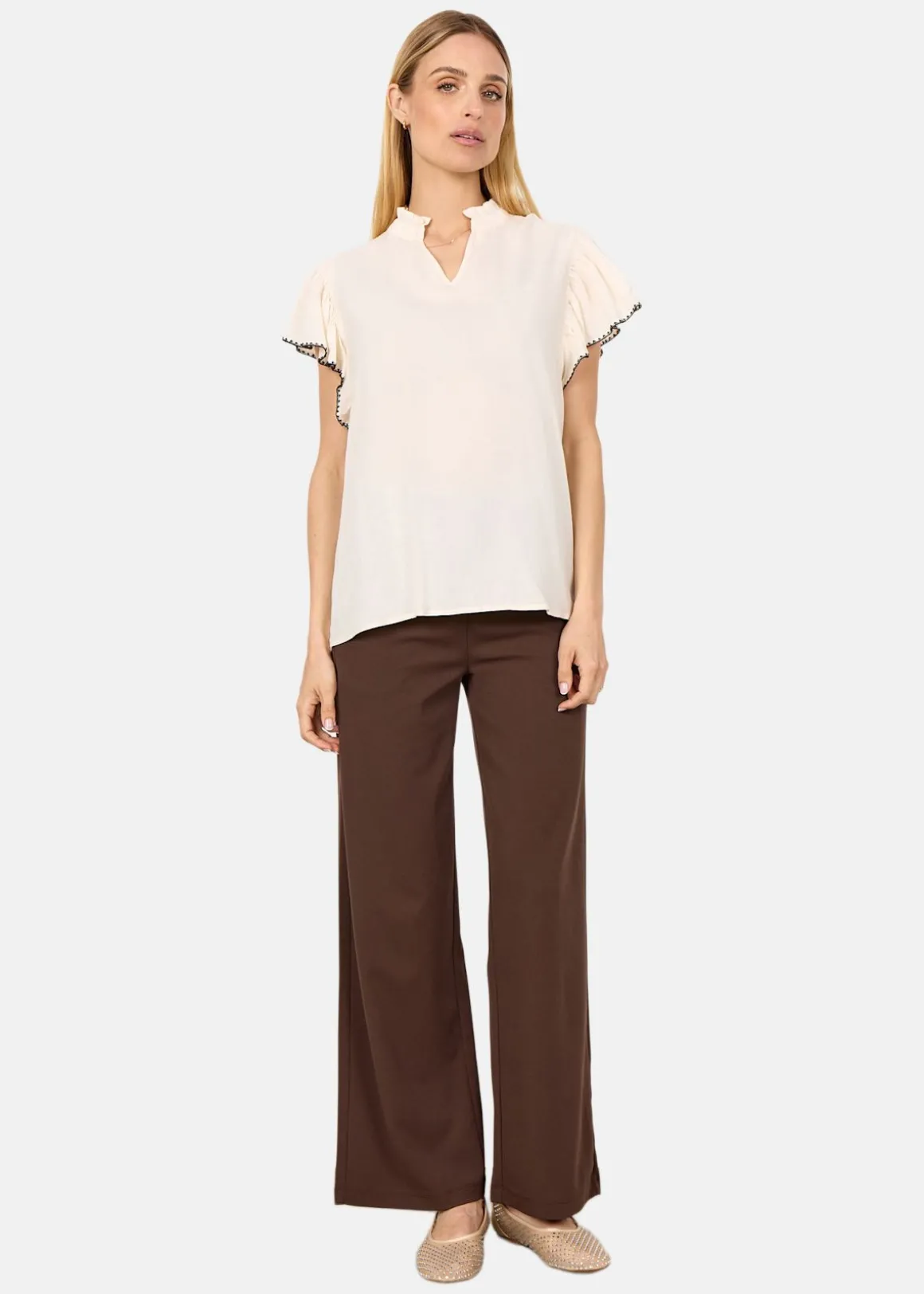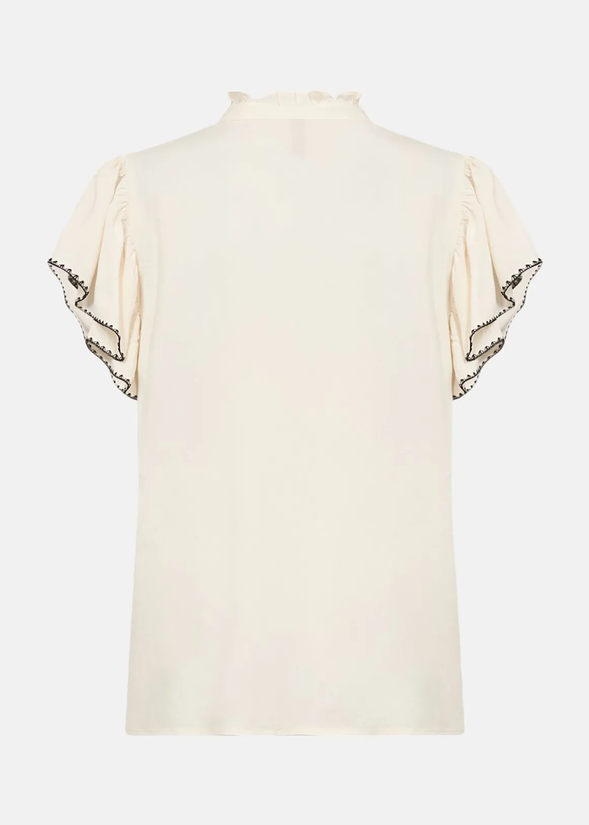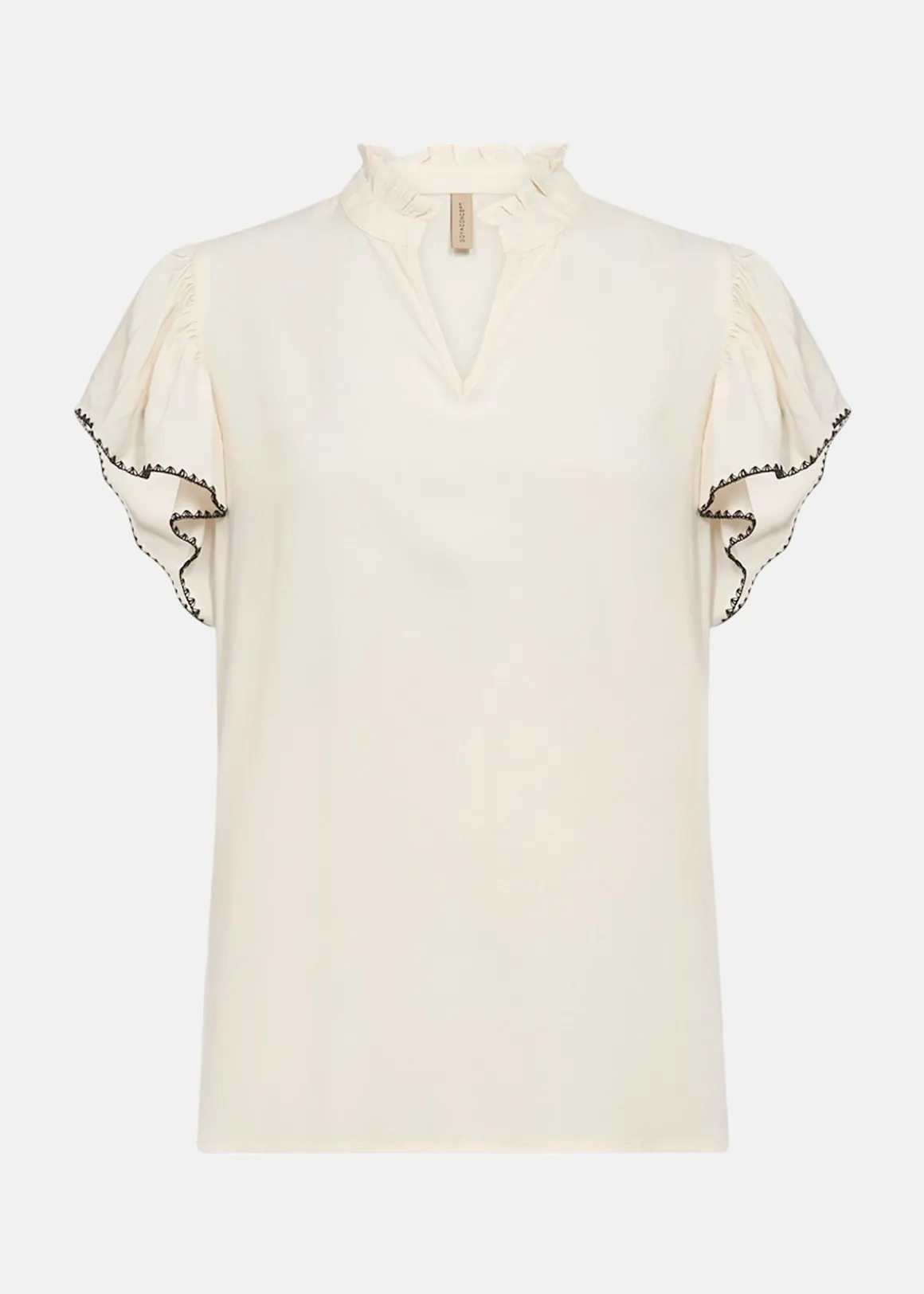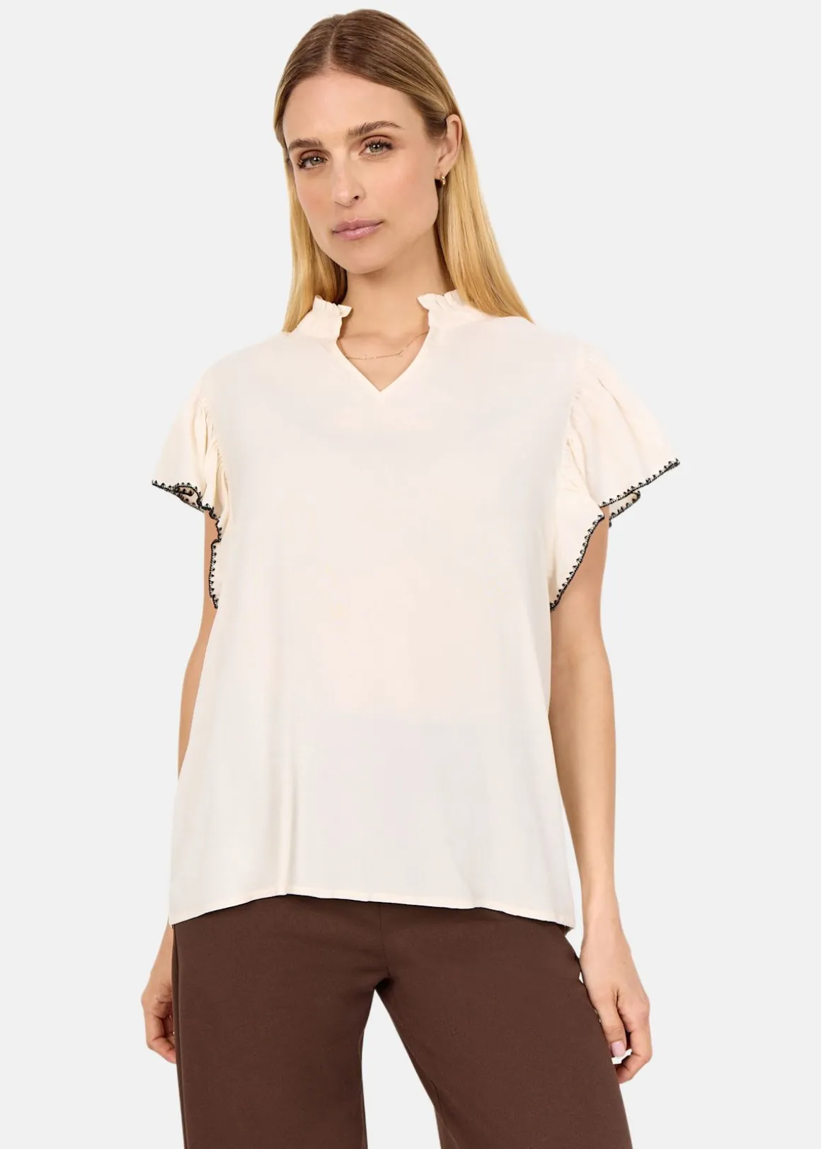 SC-RADIA 215 Blouse är en elegant och hållbar blus tillverkad av LENZING ECOVERO viskos. Den har en sofistikerad hög halskrage med volangdetaljer som ger en feminin touch. Cap-ärmarna med fin kant och V-ringningen kompletterar designen, vilket gör den perfekt för både vardag och festliga tillfällen. Materialet, 100% viskos, säkerställer komfort och stil.