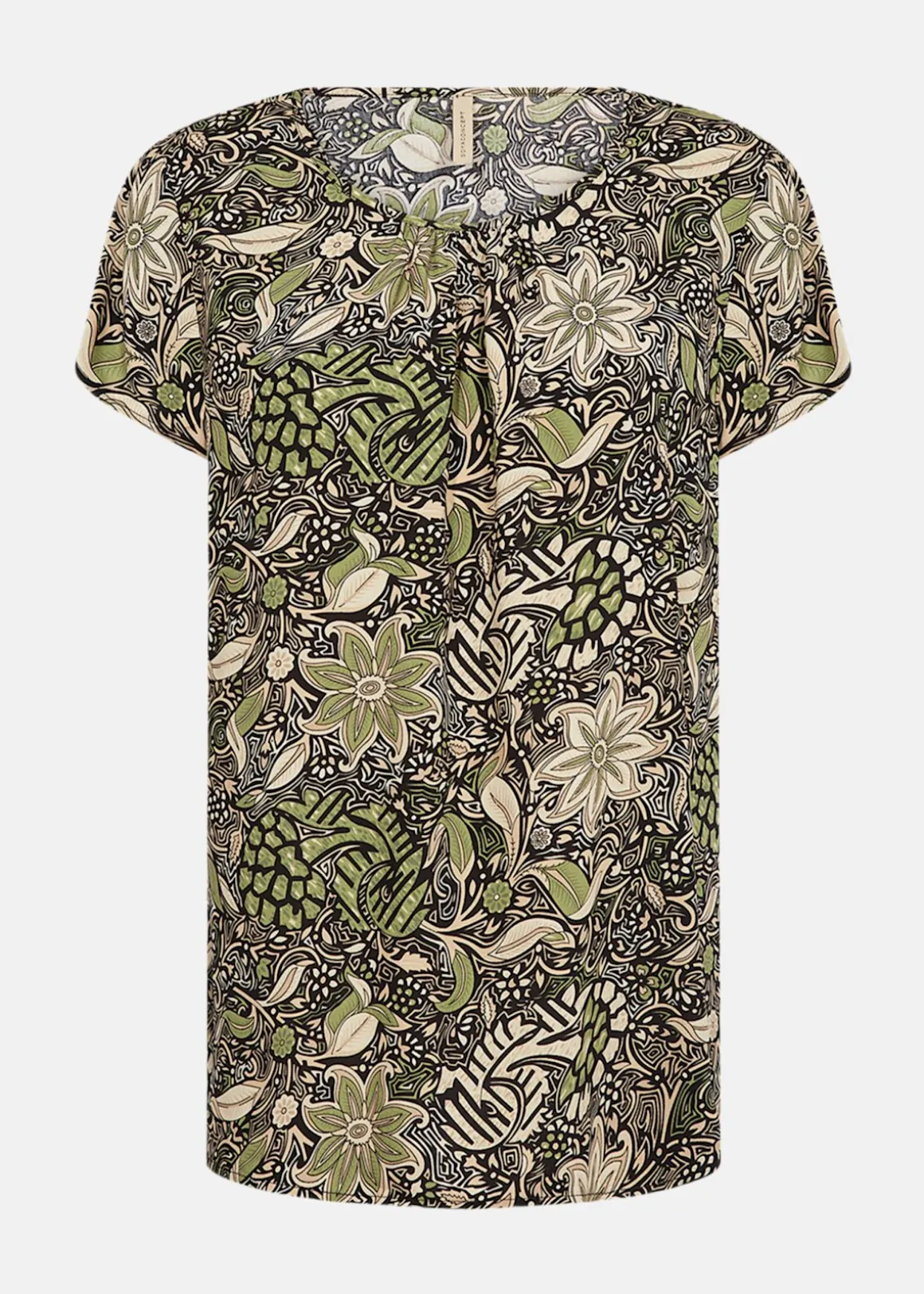 Denna topp erbjuder en stilren design med en rundad halsringning och korta ärmar, vilket gör den till ett mångsidigt plagg. Det detaljerade allover-mönstret ger en unik touch, medan materialet i 100% LENZING ECOVERO viskos säkerställer komfort och hållbarhet. Perfekt att kombinera med skräddarsydda byxor eller en kjol för en smart och avslappnad look.