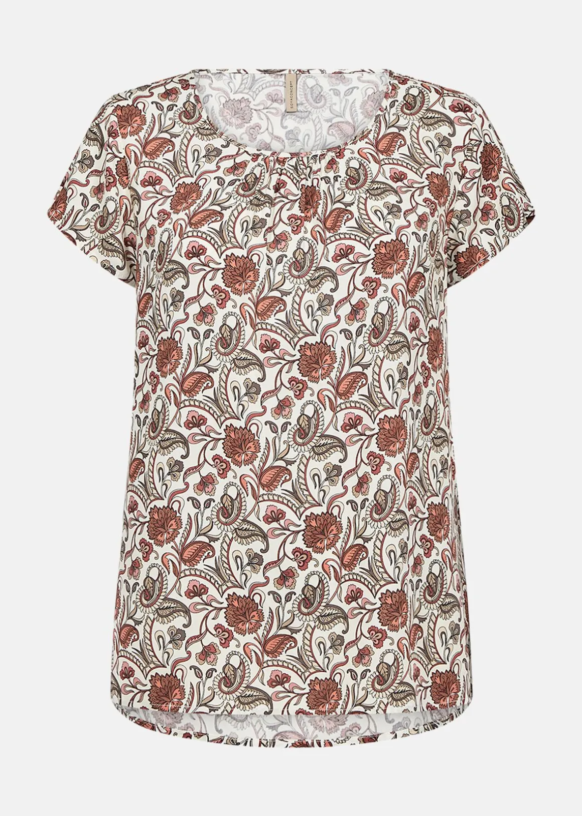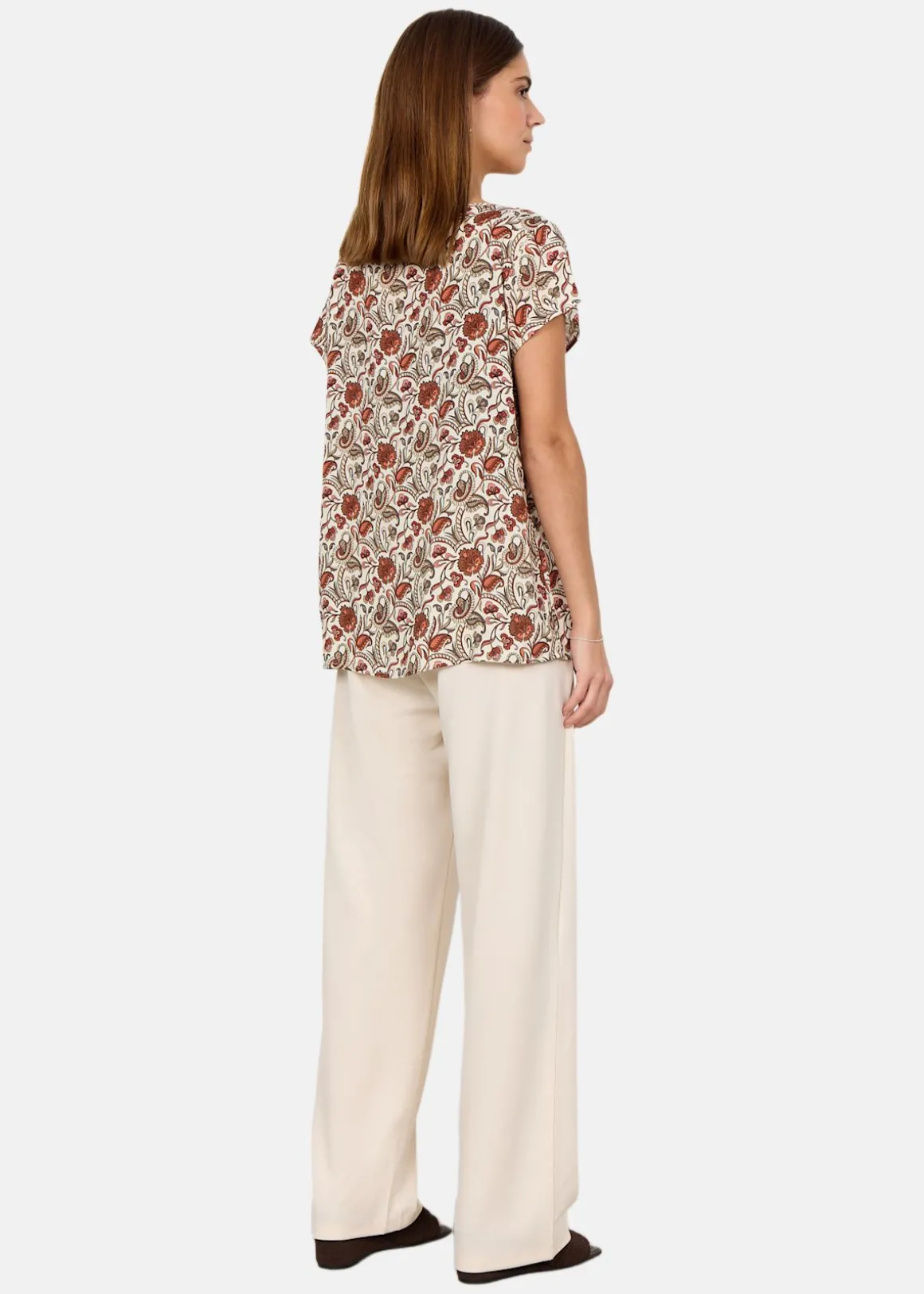 SC-SAMEA 1 Blouse är en stilren och bekväm blus tillverkad av hållbar LENZING ECOVERO viskos. Den har en klassisk rund halsringning och korta ärmar som ger en avslappnad känsla. Det detaljerade blommiga trycket tillför en feminin touch, vilket gör den perfekt för både vardag och fest. Materialet, 100% viskos, säkerställer en mjuk och skön passform.