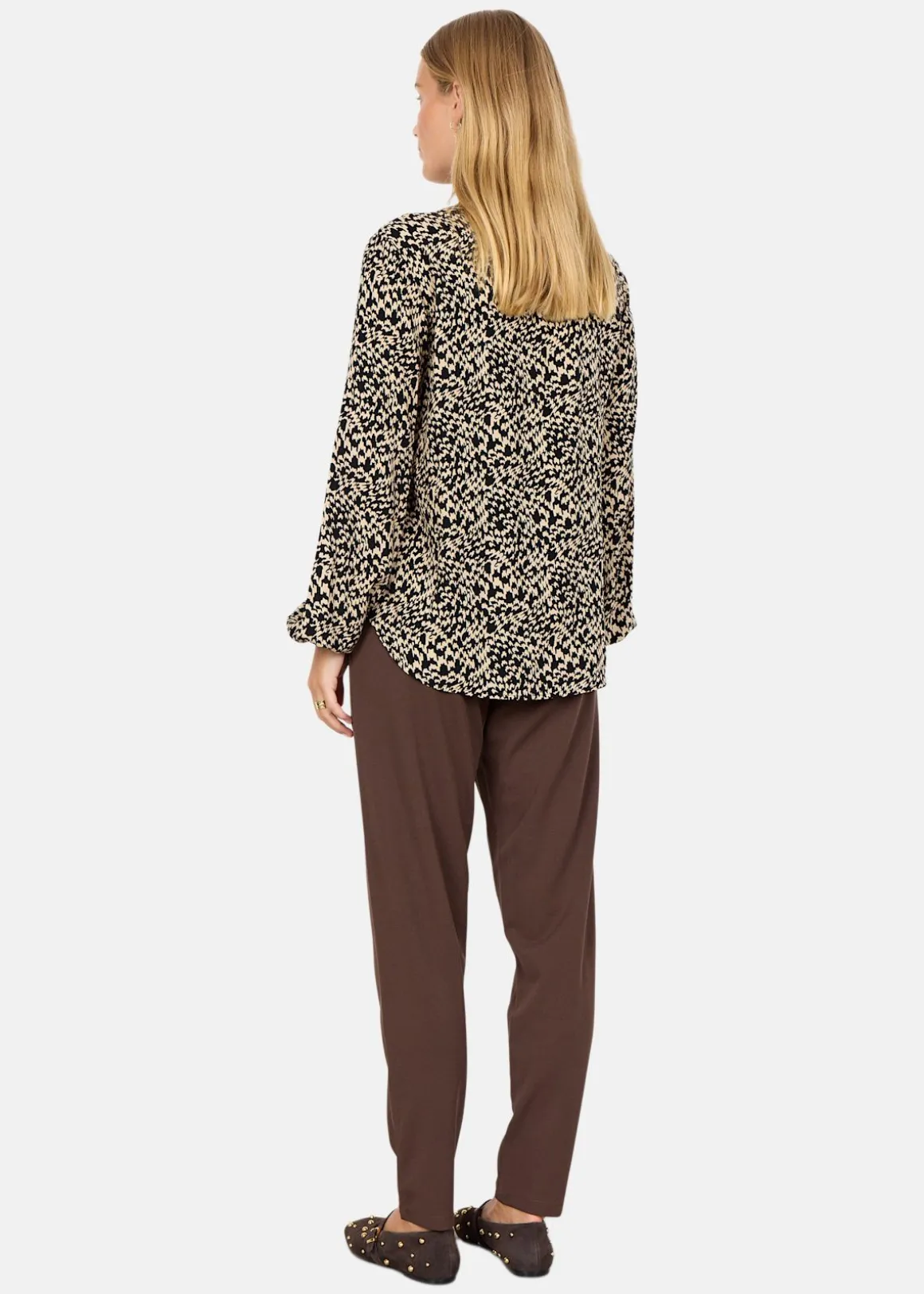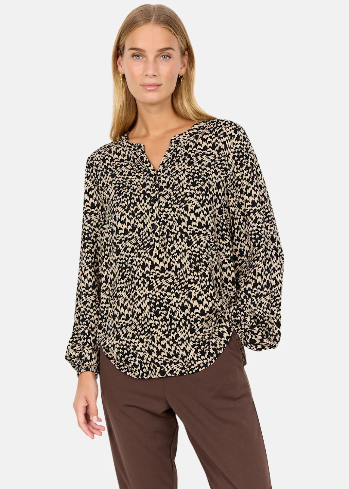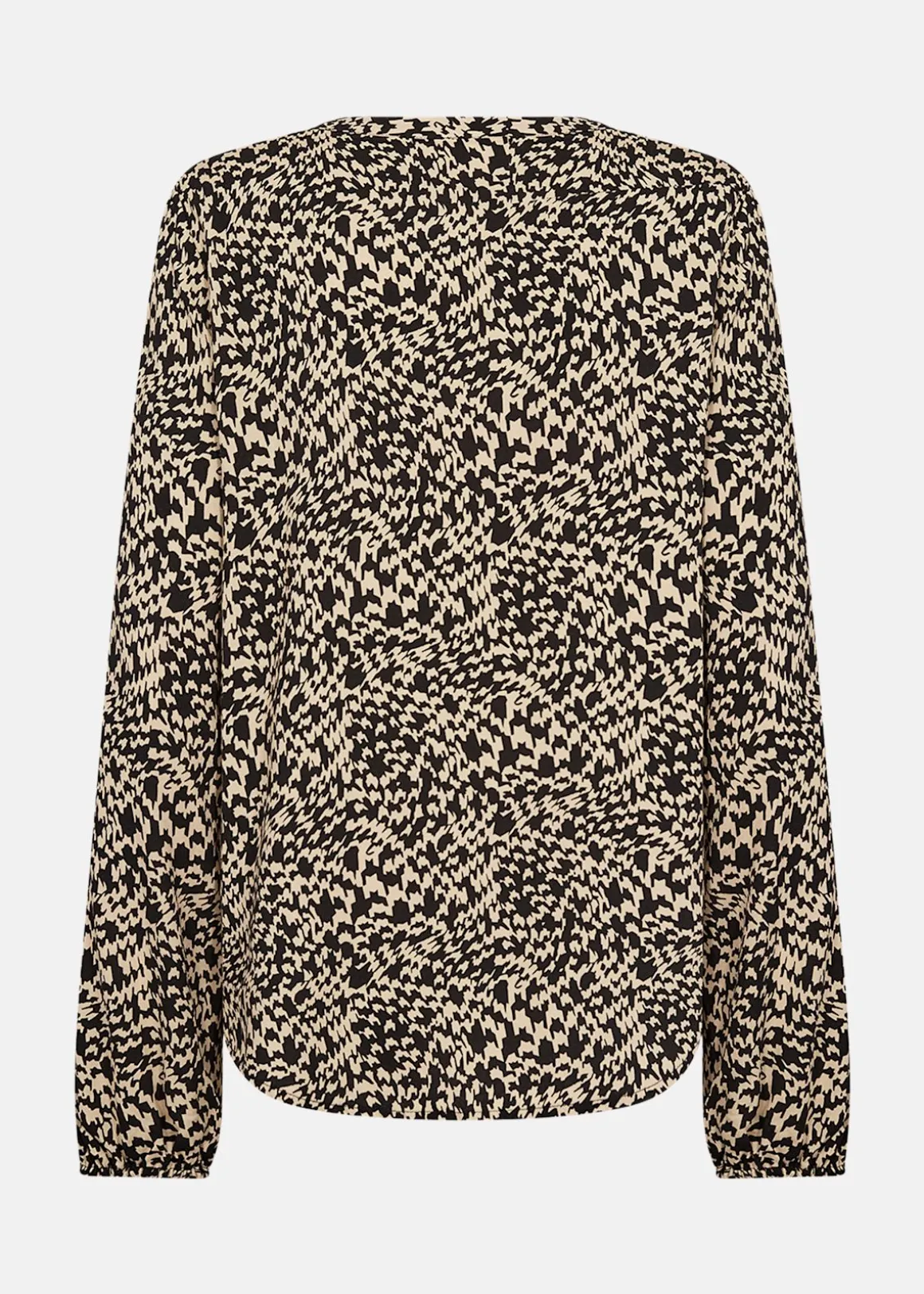 SC-VAN 1 Blus är tillverkad av hållbar viskos och erbjuder en stilren design med en V-ringad hals och knäppning framtill. De långa ärmarna med elastiska muddar ger en bekväm passform, medan det abstrakta trycket tillför en modern touch. Perfekt att kombinera med både skräddarsydda byxor och denim för en mångsidig stil.